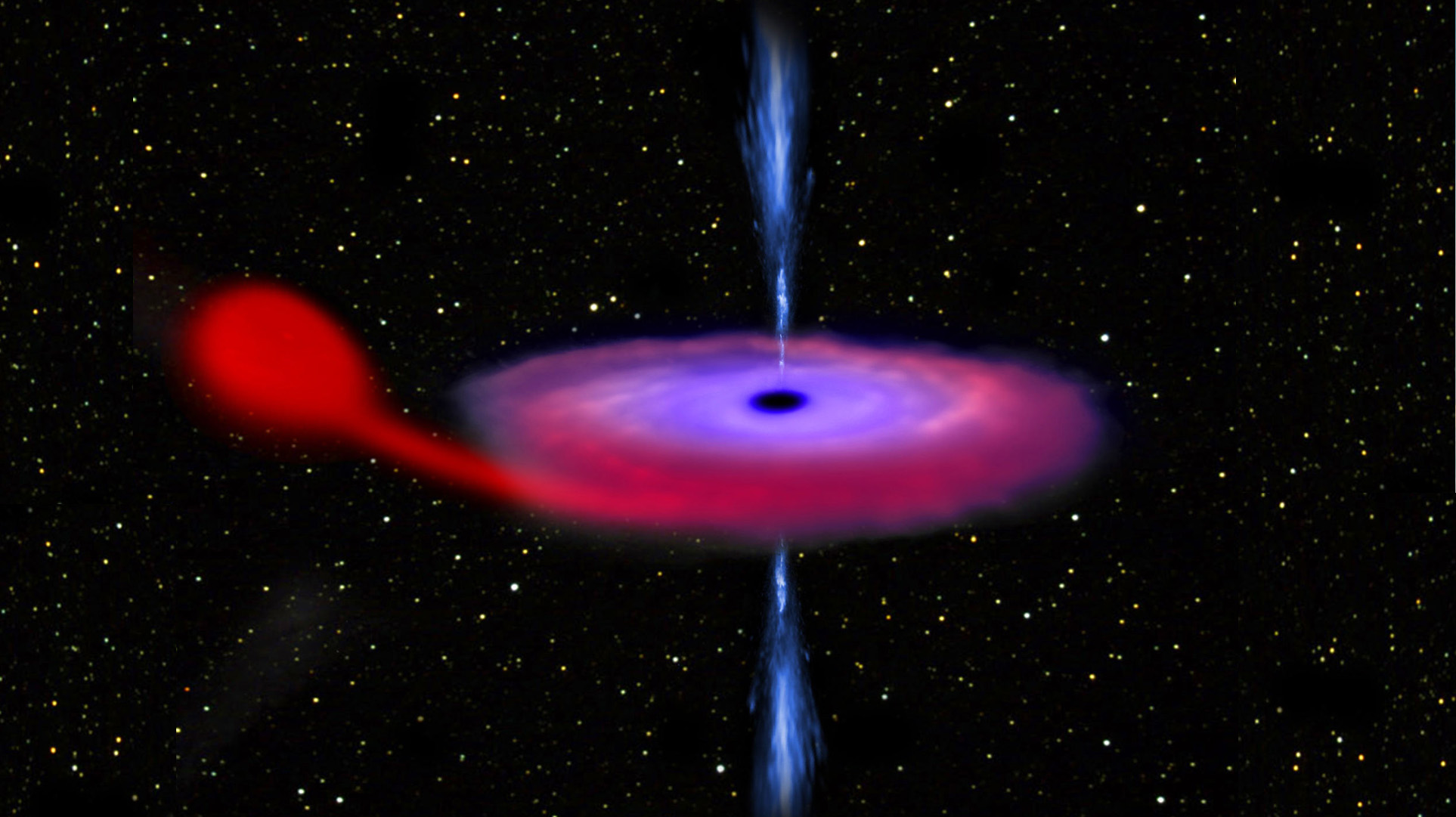 Samalla osa kaasusta suihkuaa mustan aukon napa-alueilta ylös- ja alaspäin suurina suihkuina, aivan kuten otsikkokuvassa oleva piirros osoittaa.
