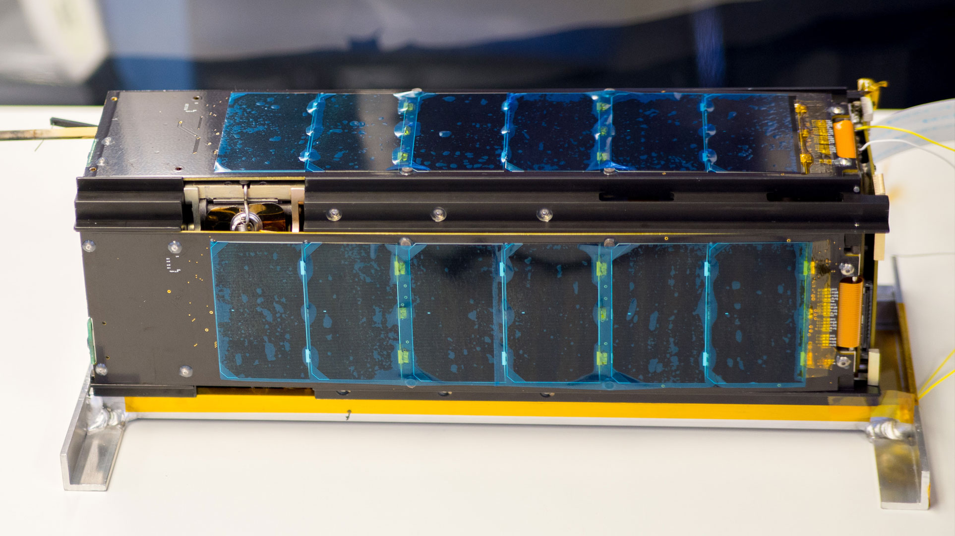 Otsikkokuvassa on satelliitti kuvattuna ennen laukaisua, ja sen avaruudessa levälleen avautuneet aurinkopaneelit näkyvät hyvin sen ulkosivuilla.