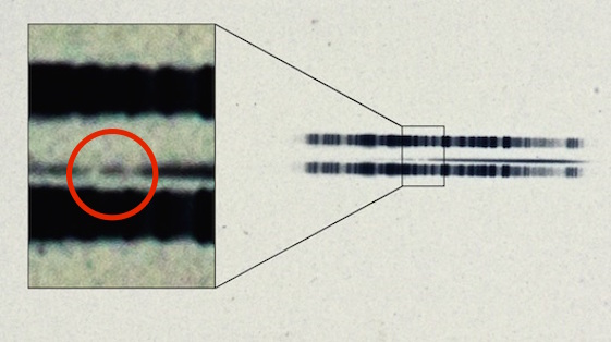 Negatiivikuvassa varsinainen spektri näkyy ohuena mustana juovana ja ympyröidyt kalsiumin viivat erottuvat valkoisina.