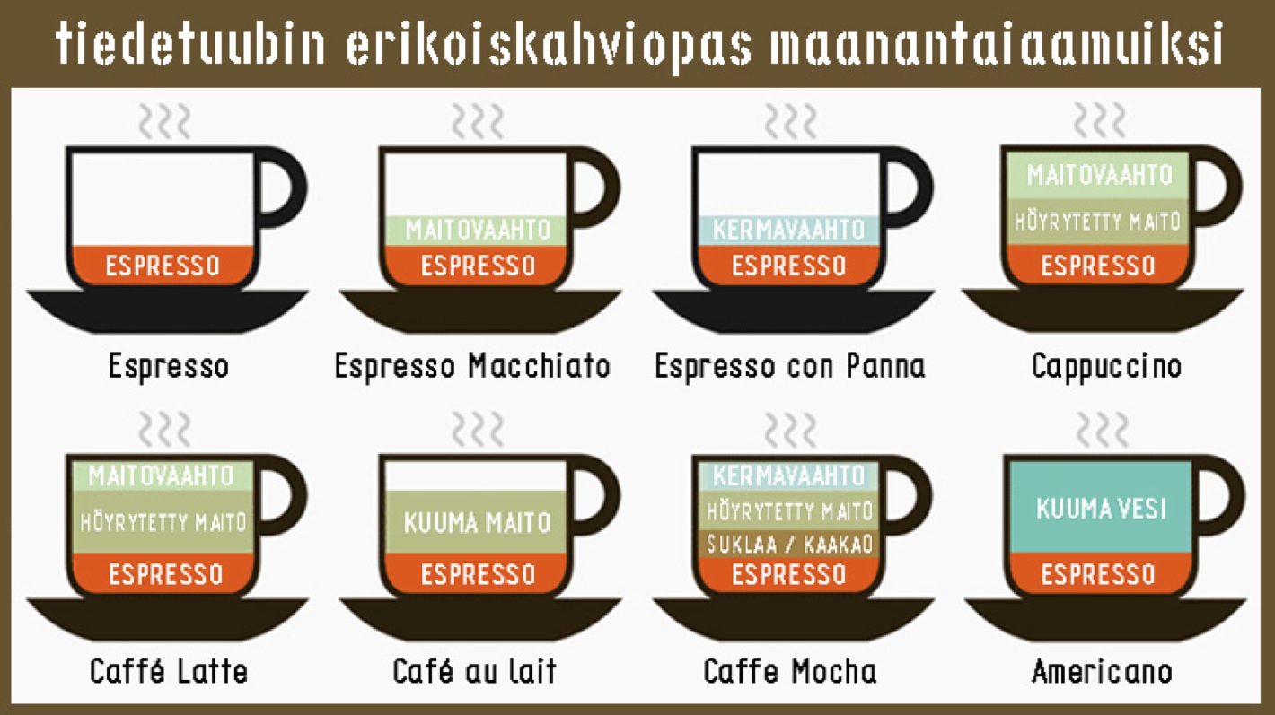 Tiedetuubissa pidetään hyvästä kahvista, joten teimme (ainakin etelässä) harmaahkoa maanantaiaamua piristämään pienen kaavion siitä, mitä yleisimmin eri tyyppisiin erikoiskahveihin laitetaan. Koska erikoiskahvien tekeminen on kuin oma herkullinen tieteenalansa, on sillä tietysti paikkansa myös tiedesivustolla!