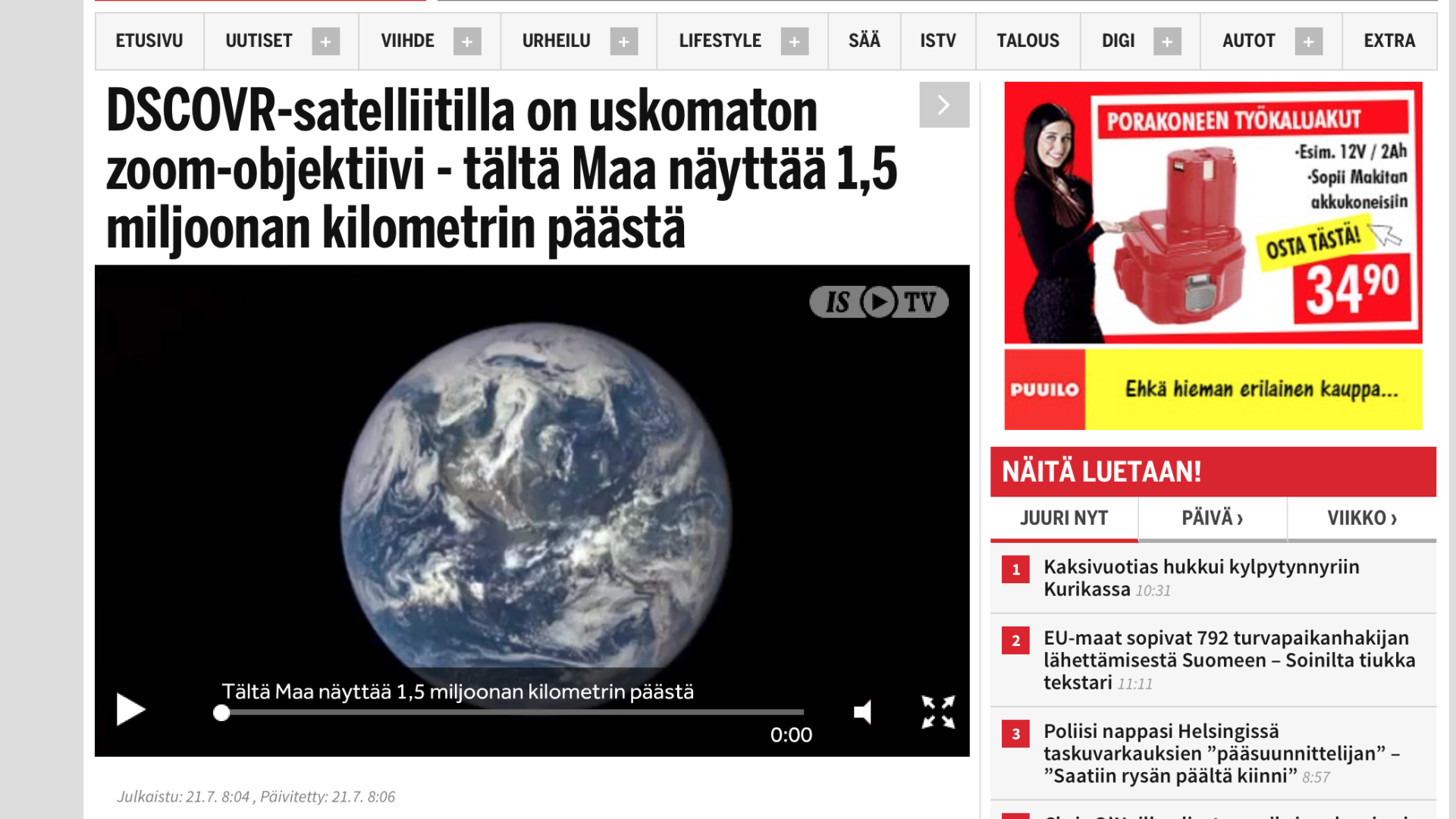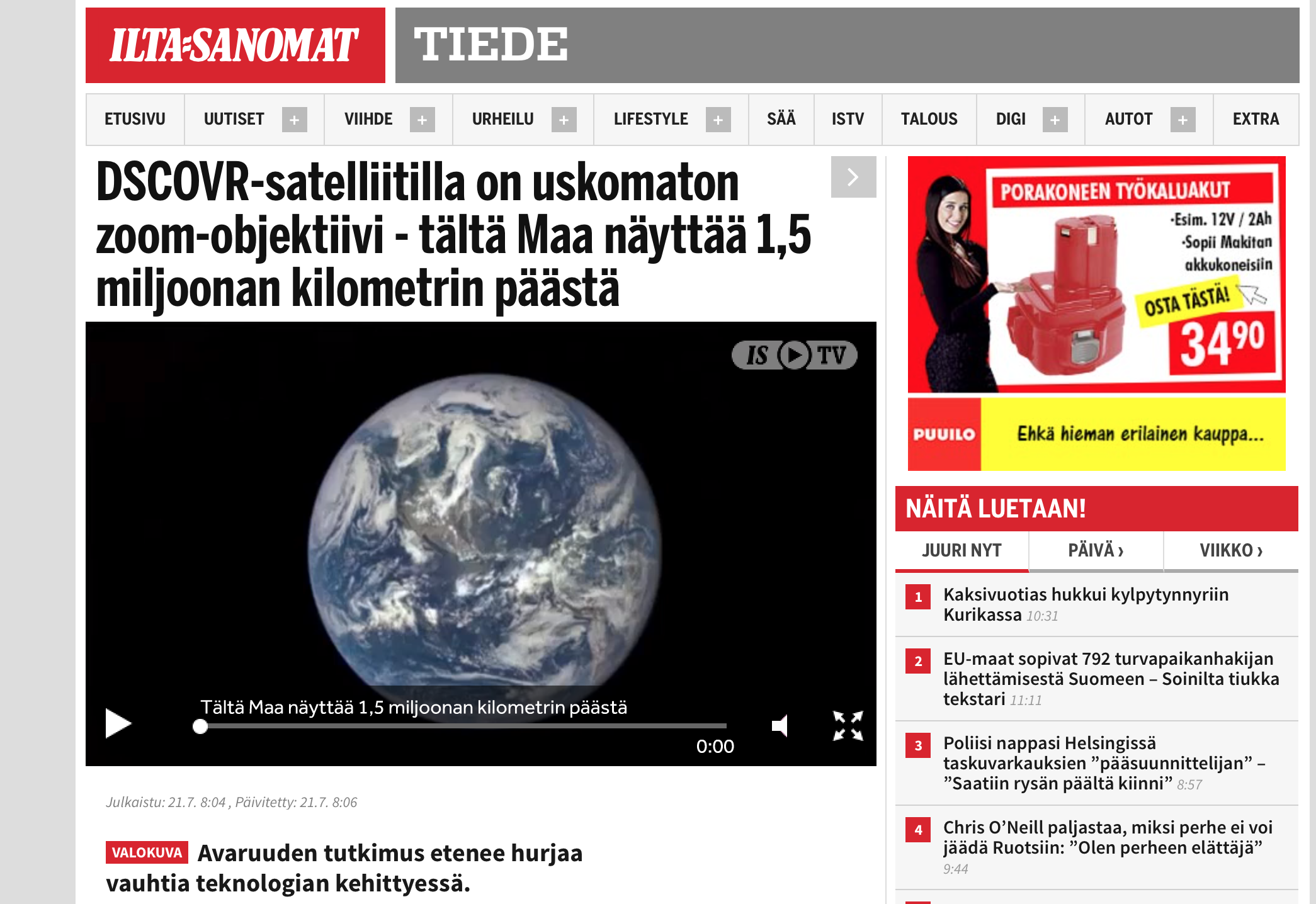 Ilta-Sanomat kirjoittaa tänään NASAn DSCOVR-avaruusaluksen lähettämästä "ensimmäisestä" (siis NASAn juuri julkaisemasta, mutta ei suinkaan ensimmäisestä) kuvasta ja mainitsee jo otsikossa, että "DSCOVR-satelliitilla on uskomaton zoom-objektiivi".