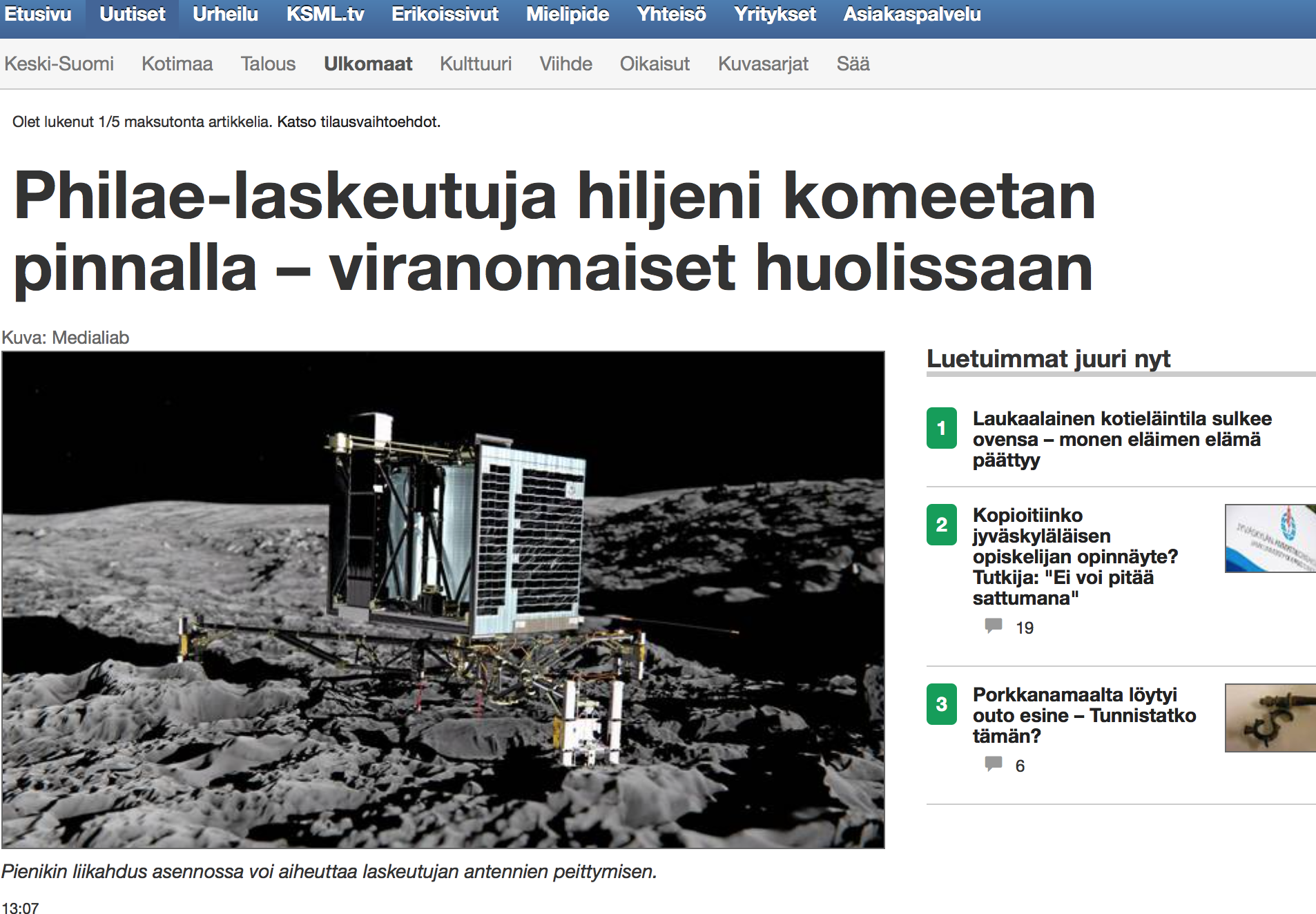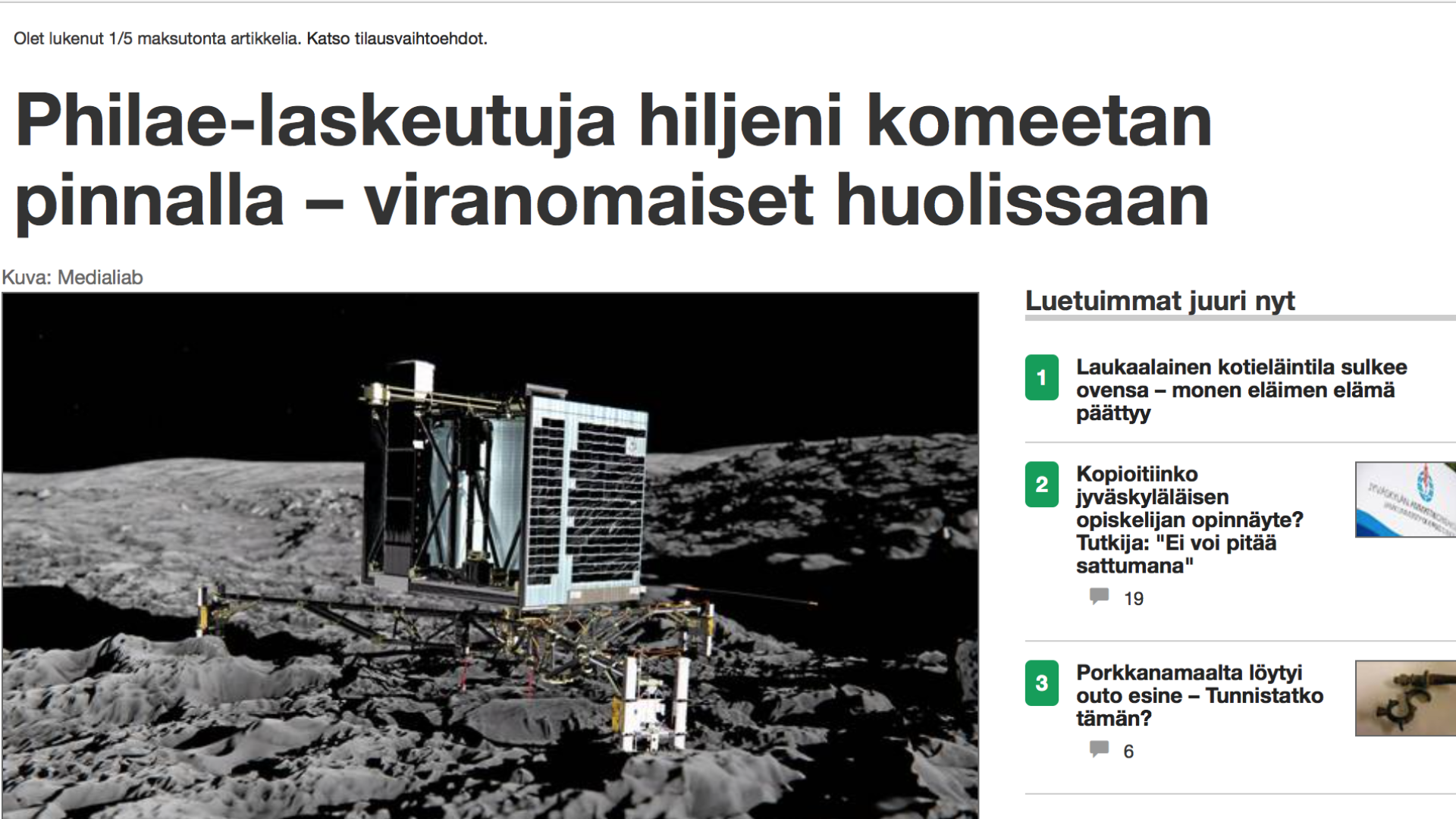 Jännimmän otsikon (mikä silmiimme on juttulistauksissa sattunut) veti Keskisuomalainen, jonka mukaan "Philae-laskeutuja hiljeni komeetan pinnalla - viranomaiset huolissaan".