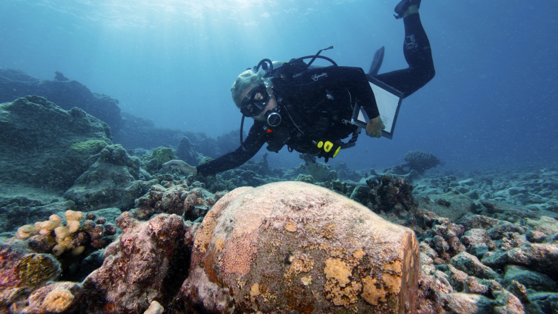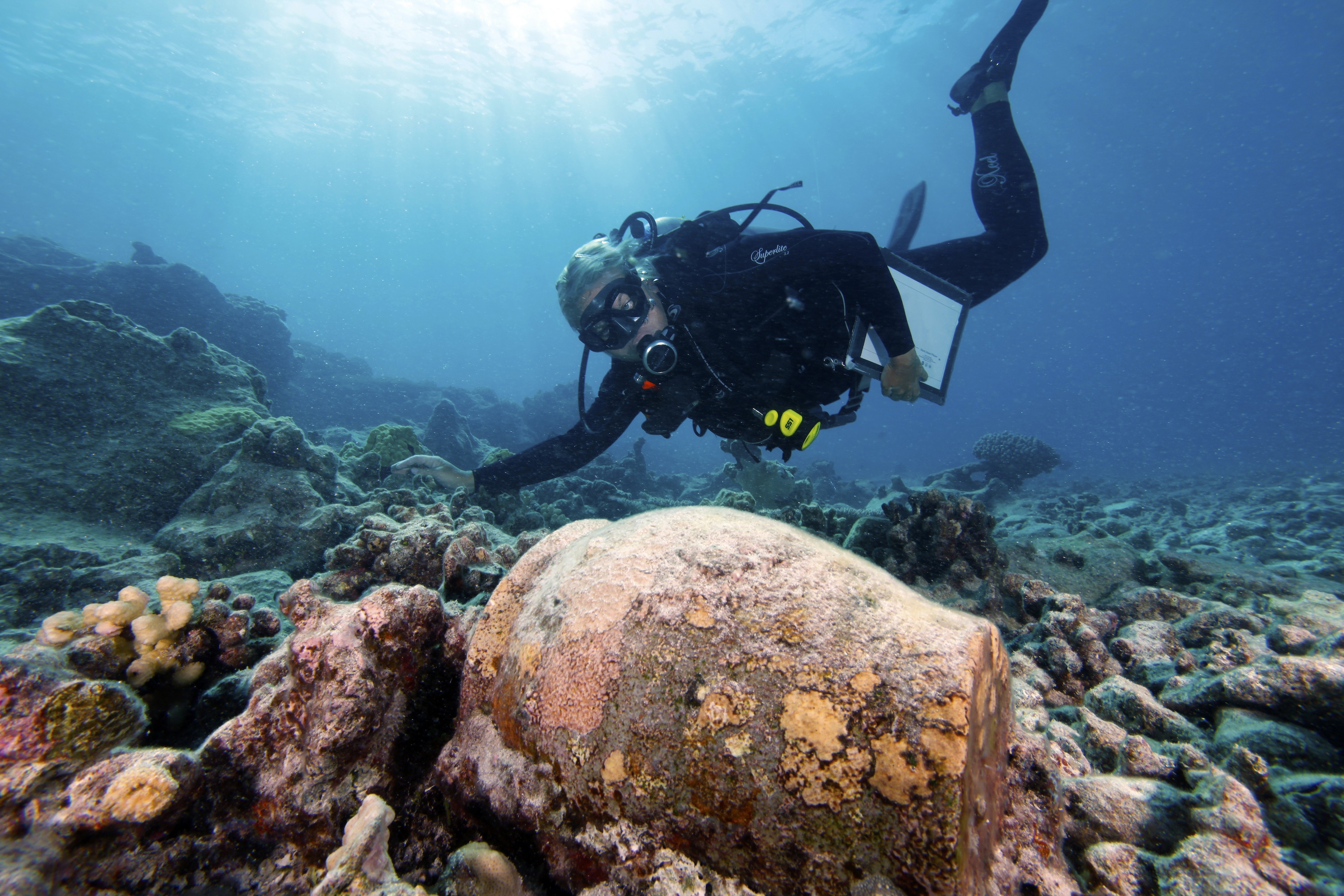 Yhdysvaltain meren- ja ilmastontutkimuslaitoksen NOAA:n meriarkeologi Kelly Gleason tutkimassa ruukkua Shark-saaren luona Papahānaumokuākean kansallispuistossa Havaijilla.