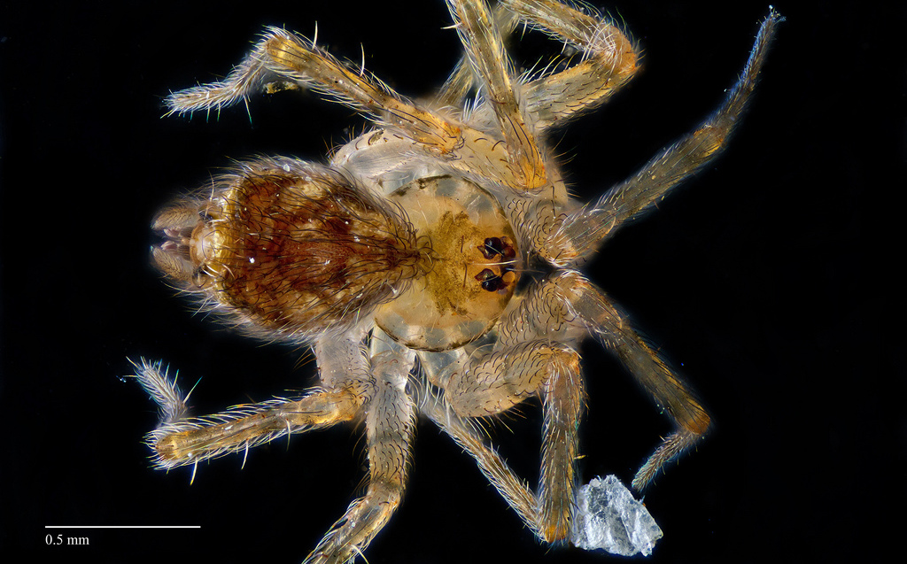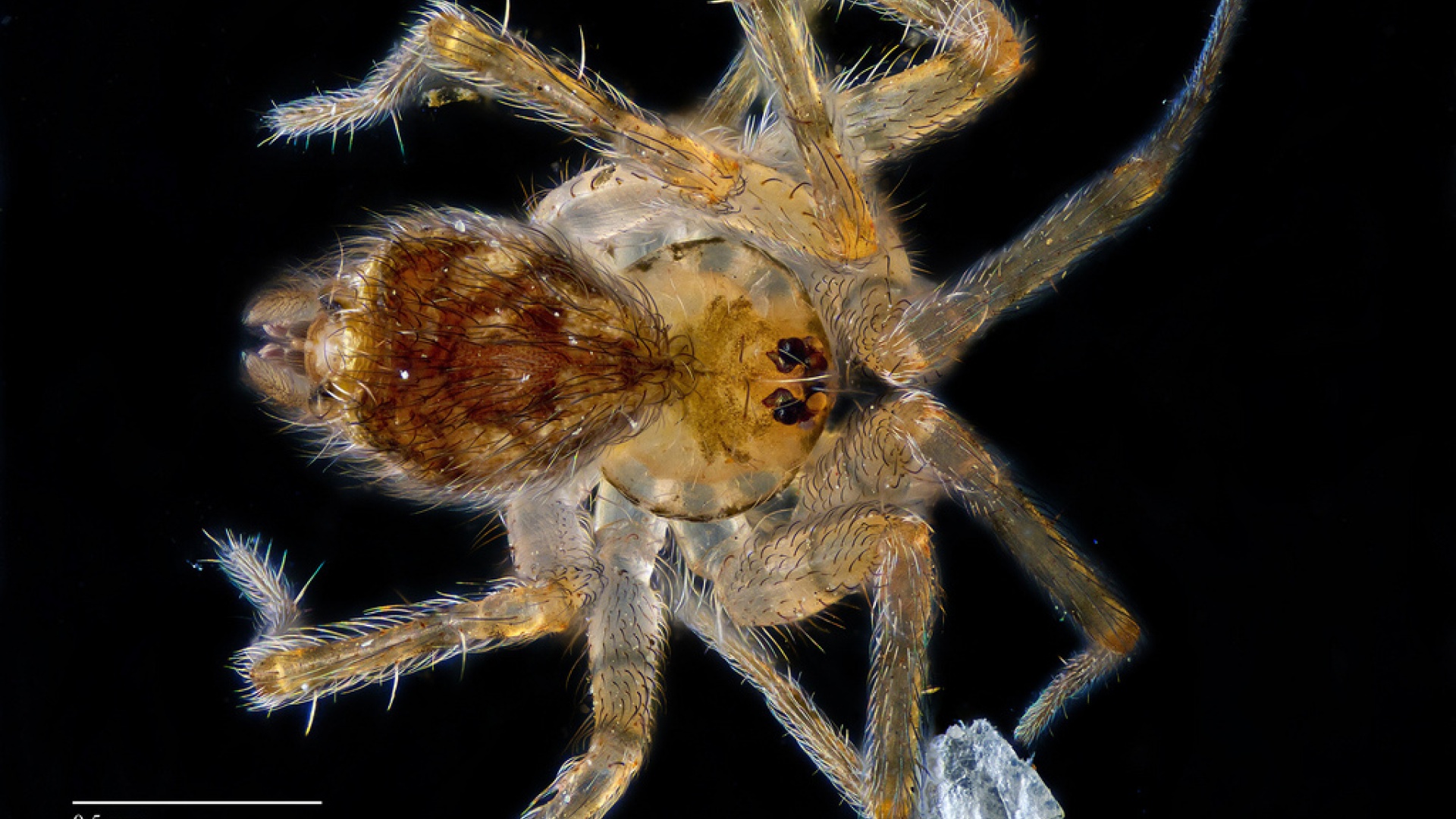 Hämähäkki mikroskoopin avulla 100-kertaisesti suurennettuna. Hämähäkki oli noin 1,5 mm pitkä ja se päästettiin takaisin luontoon kuvan ottamisen jälkeen.