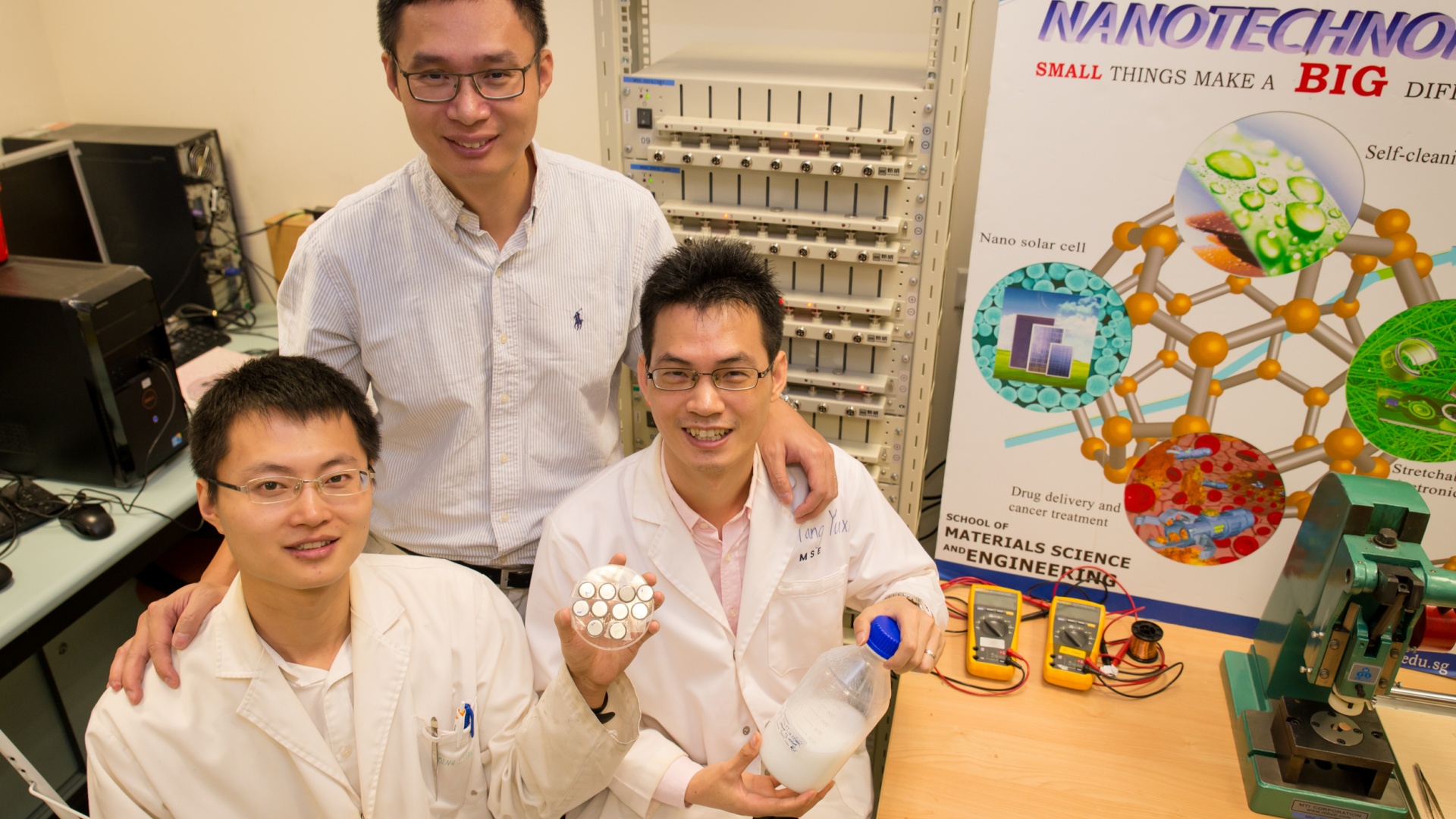Kuvassa ylhäällä professori Chen Xiaodong ja alhaalla tutkija Tang Yuxin (oikealla) ja tohtorikoulutettava Deng Jiyang kädessään uuden akun prototyyppejä.
