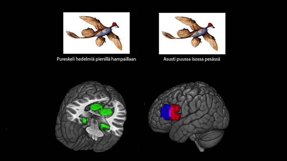 Kutakin eläintä koskevat tiedot niiden käyttämästä ravinnosta ja asuinpaikoista tallentuivat aivojen "syömis-" (kuvan vihreät alueet) ja "asumis"-alueille (siniset ja punaiset). Ne aktivoituivat sen mukaan, kummasta asiasta uutta tietoa oli tarjolla.