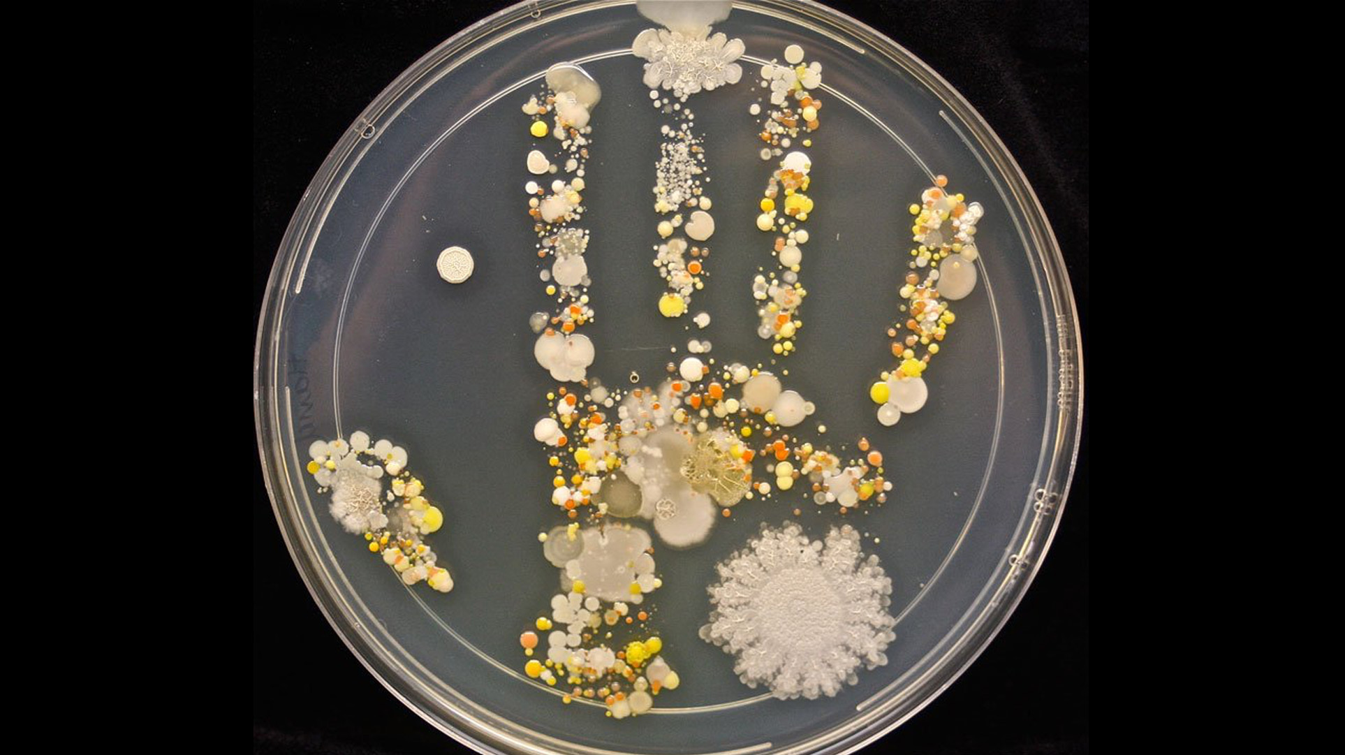 Päivän kuvan on tehnyt mikrobiologi Tasha Sturm siten, että hän pyysi kahdeksanvuotiasta poikaansa painamaan kätensä yksinkertaisesti kasvatusliuokseen. Sen jälkeen maljan annettiin olla kahden vuorokauden ajan lämpimässä, kunnes kädessä olleet bakteerit, hiivat ja sienet olivat lisääntyneet ja muodostaneet kukin oman tyypillisen kuvionsa ... ja samalla käden kuvion.