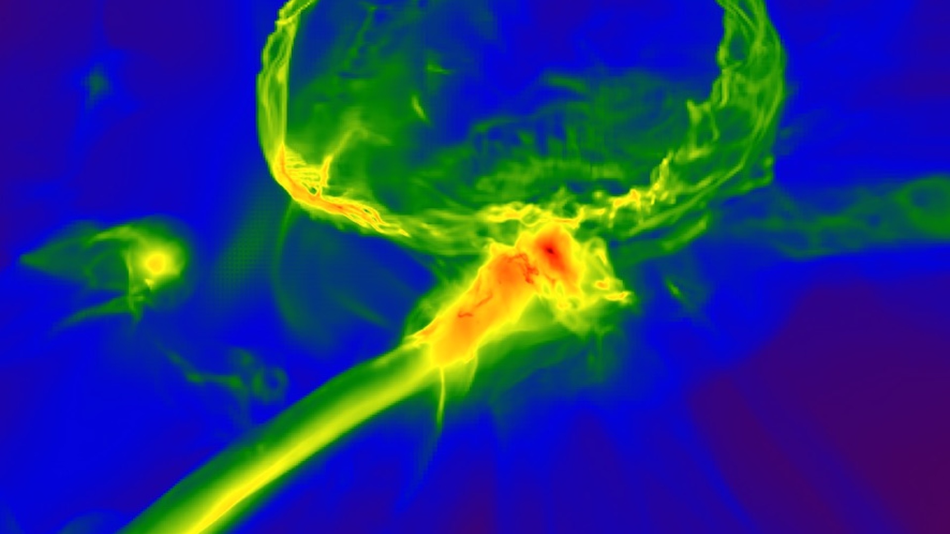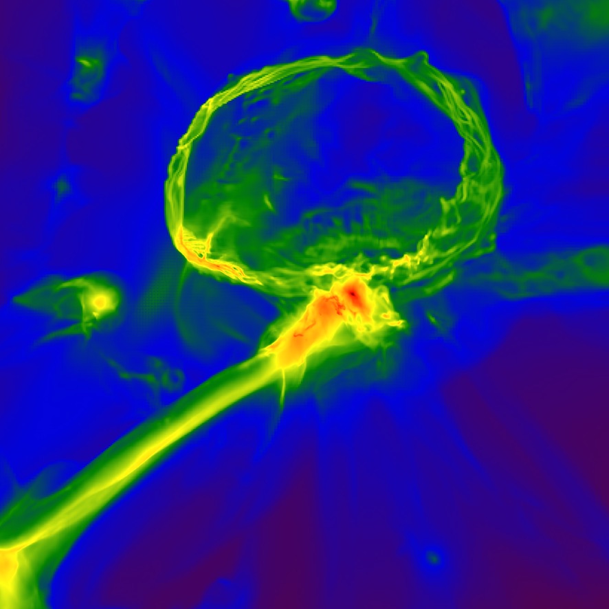 Kuva on simulaatiosta, jossa tarkastellaan tähden räjähdystä varhaisessa maailmankaikkeudessa. Rengasmainen rakenne on kaasupilvi, joka laajenee supernovaräjähdyksen seurauksena ja rikastaa lähistöllä olevaa tiheämpää pilveä (merkitty punaisella).