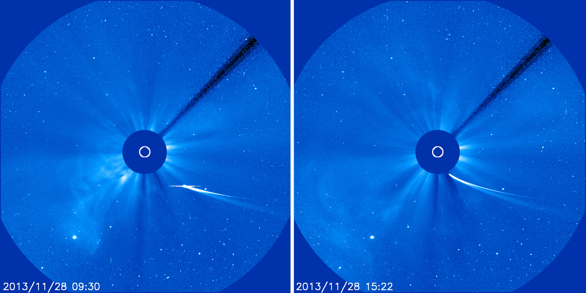 Sitten komeetta alkoi himmentyä nopeasti ja sen kirkkaus putosi muutamassa tunnissa selvästi. Tarkkoja lukuarvoja ei vielä ole tiedossa, mutta SOHO-luotaimen LASCO-instrumentin kuvissa Auringosta noin kello seitsemän suunnassa oleva tähti on Skorpionin tähdistön Antares, jonka kirkkaus on +1.