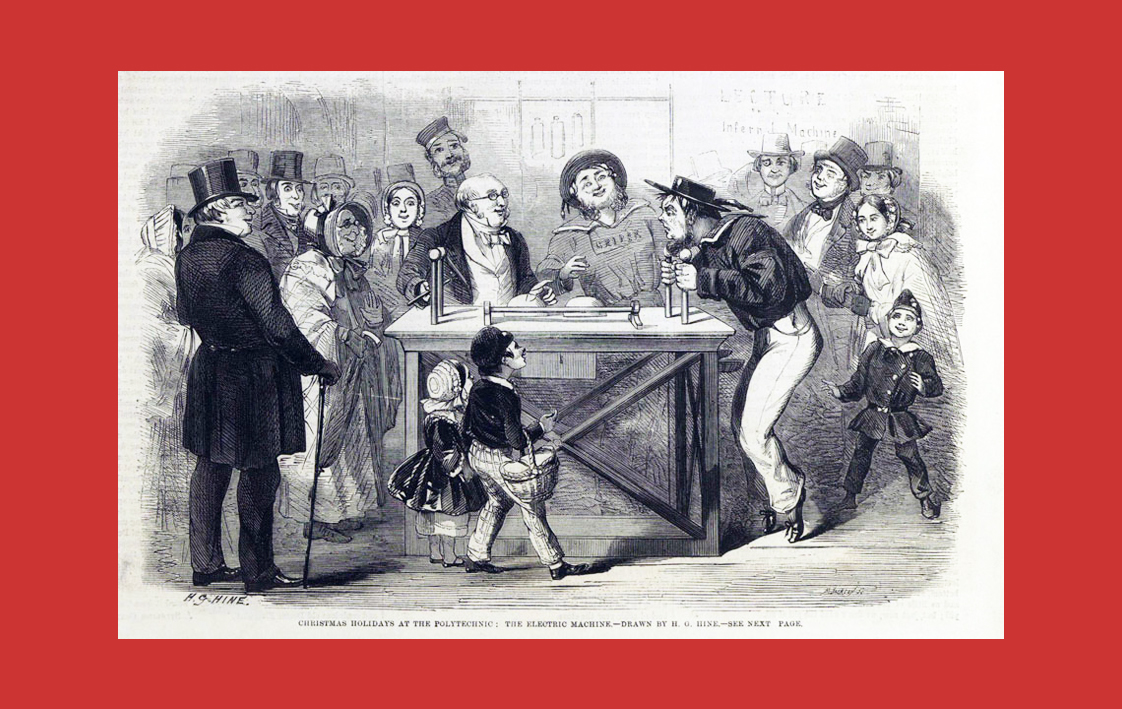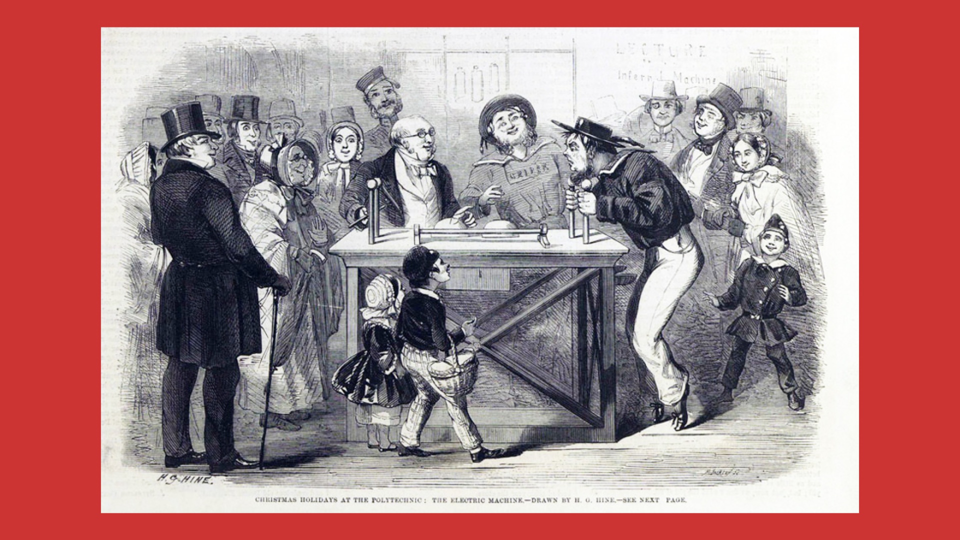 Vuodelta 1858 peräisin oleva piirroskuva esittää "joulun juhlintaa polyteknillisessä instituutissa". Havaintoesityksessä merimiesrukka on houkuteltu tarttumaan "sähkökojeen" kahvoihin, jolloin hän sai palkkioksi muun yleisön suureksi riemuksi sähköiskun.