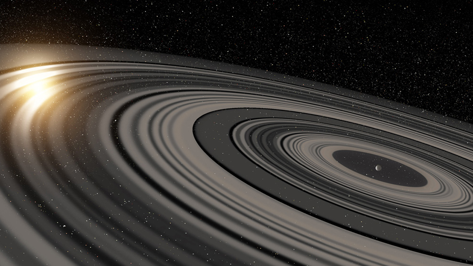 Sen jännittävä rengassysteemi on säteeltään jopa 90 miljoonaa kilometriä, eli noin 200 kertaa suurempi kuin Saturnuksella.