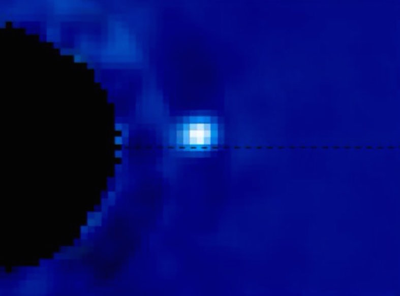 β Pic b -planeettaa on kuvattu Chilessä sijaitsevalla 8,1-metrisellä Gemini-teleskoopilla ja siihen liitetyllä huippuherkällä GPI-kameralla (Gemini Planet Imager). β Pictoris -tähti on kuvan vasemmassa laidassa näkyvän peitelevyn takana, jotta himmeä planeetta ei huku sen loisteeseen. Maa on jokseenkin planeetan ratatason suunnassa.