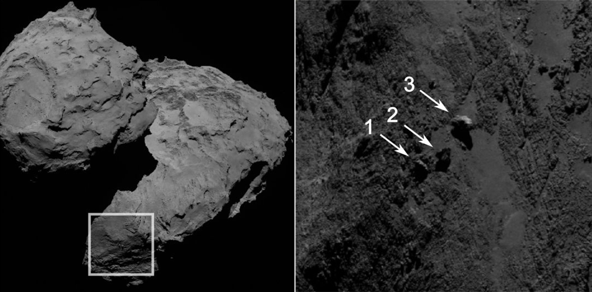 Rosetta-luotaimen OSIRIS-kameran (Optical, Spectroscopic, and Infrared Remote Imaging System) kuvissa näkyy komeetan isomman puoliskon Aker-alueella kolme kivenlohkaretta, joista suurimman (nro 3) läpimitta on noin 30 metriä. Se lepää pienen painanteen reunalla ja siitä on vain pieni alue kosketuksissa "maahan".