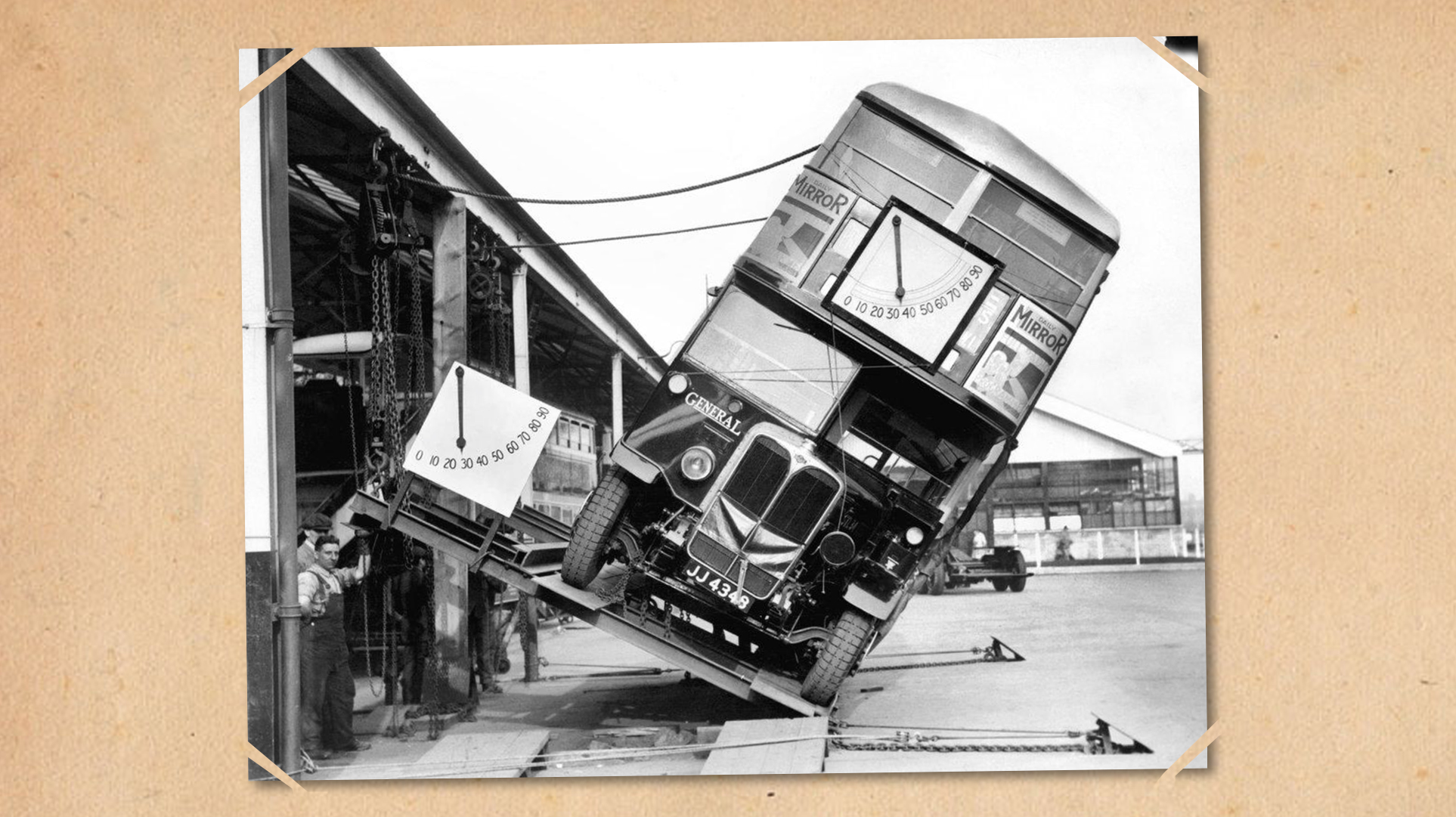 Jotta tiedettäisiin missä tuo raja tulee vastaan, on busseja testattu yksinkertaisesti kallistamalla niitä eri tavalla lastattuina. Kuvassa on Lontoon AEC Regent -tyypin bussi koetuksessa vuonna 1933.