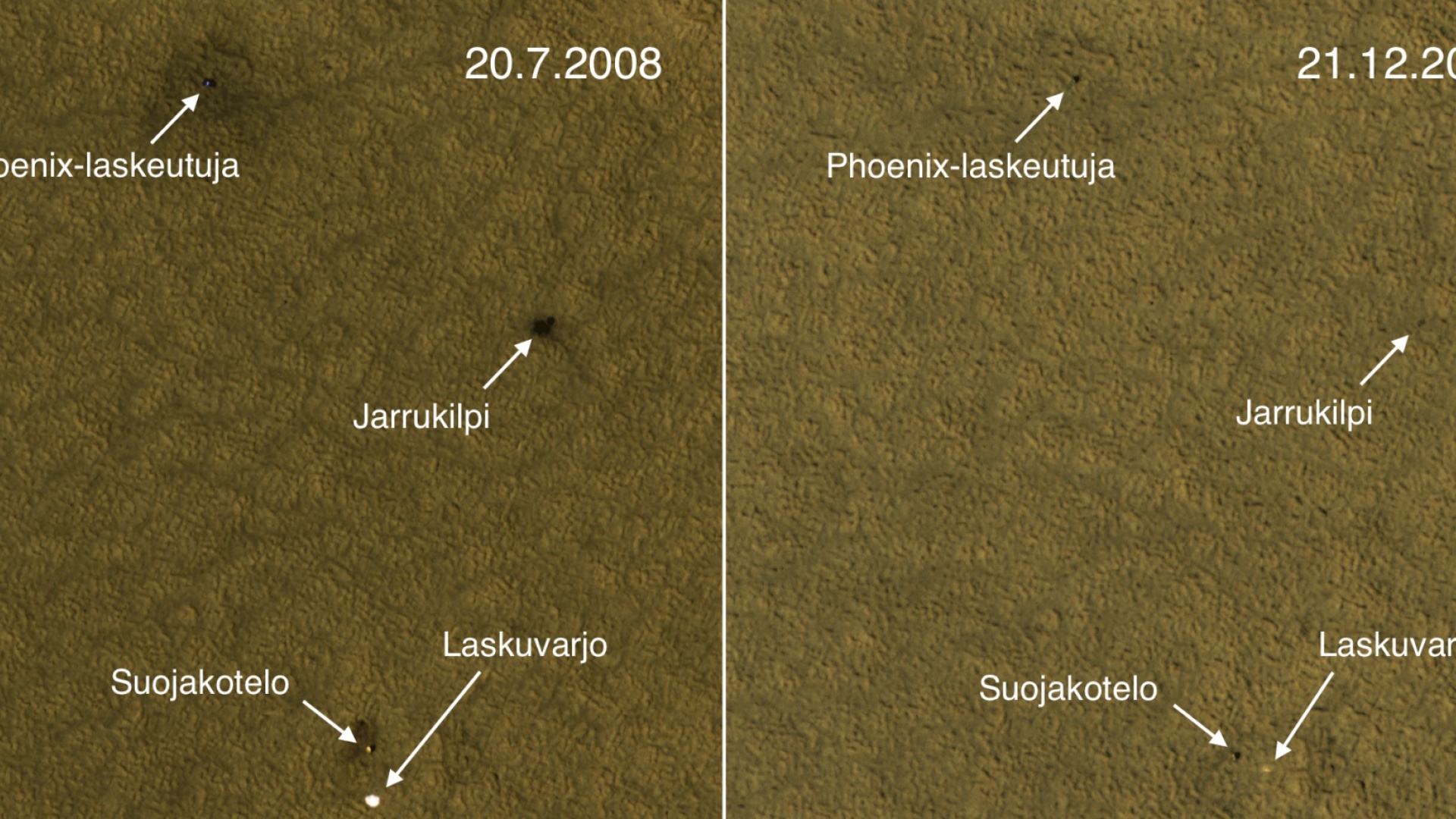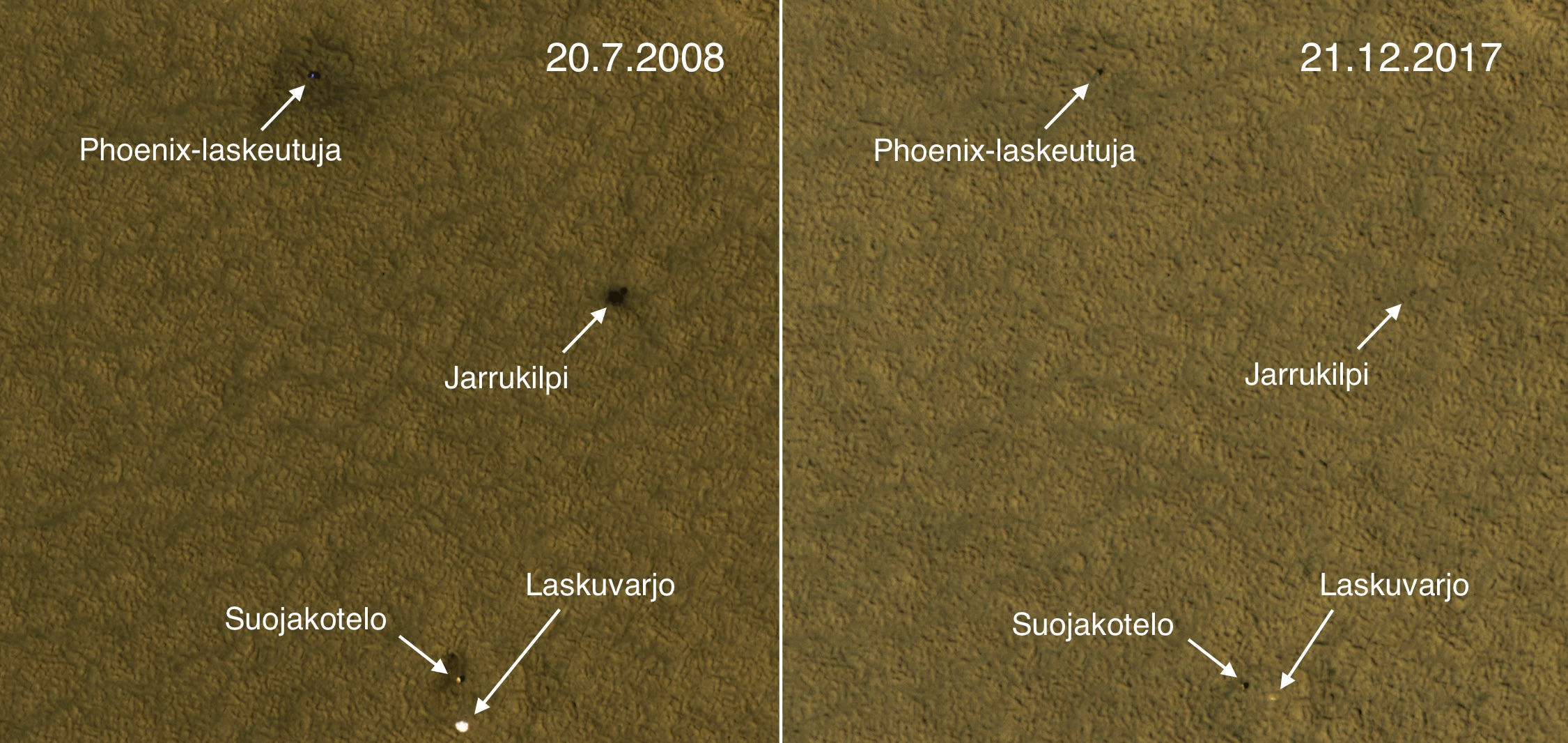 Phoenix-luotain laskeutui Marsin pohjoisille napaseuduille toukokuussa 2008. Pari kuukautta myöhemmin Mars Reconnaissance Orbiter otti HiRISE-kamerallaan (High Resolution Imaging Science Experiment) kuvan laskeutumispaikasta.