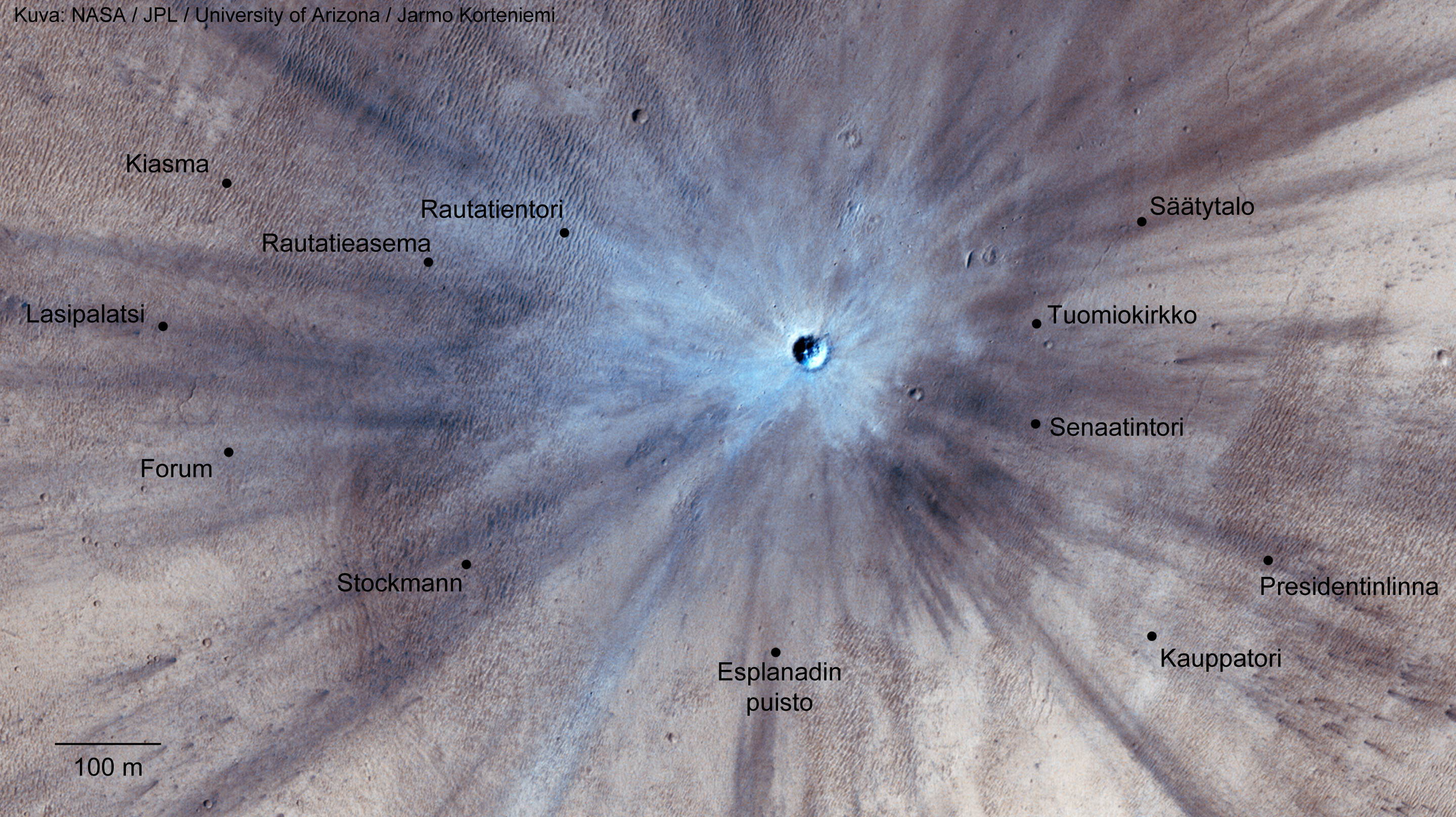 Otsikkokuva: Uusi kraatteri Marsissa. Skaalana Helsingin ydinkeskustan tunnettuja kohteita. Kuva: NASA / JPL / UA / Jarmo Korteniemi