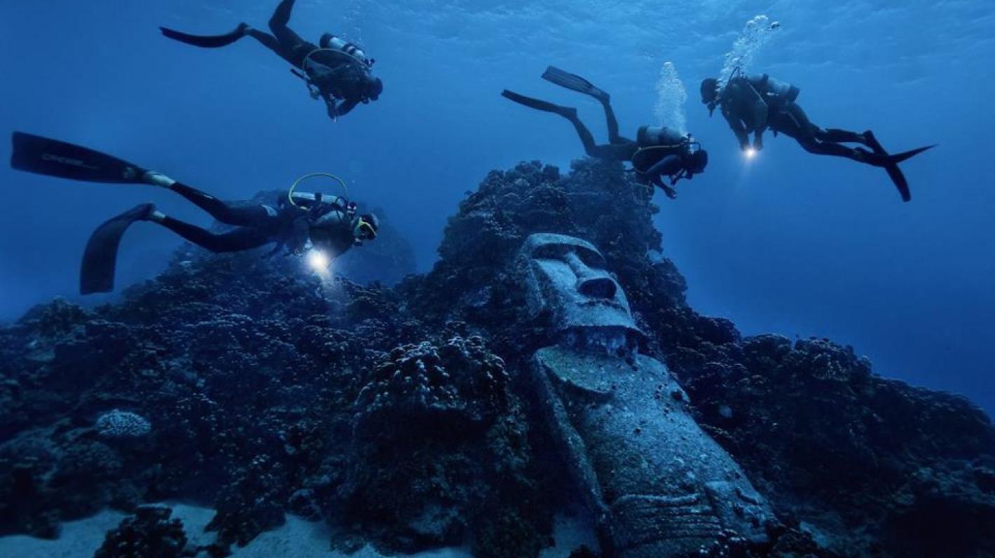 Päivän kuvassa sukeltajat tutkivat Tyynen valtameren pohjassa lähellä Pääsiäissaarta olevaa Moai -patsasta.