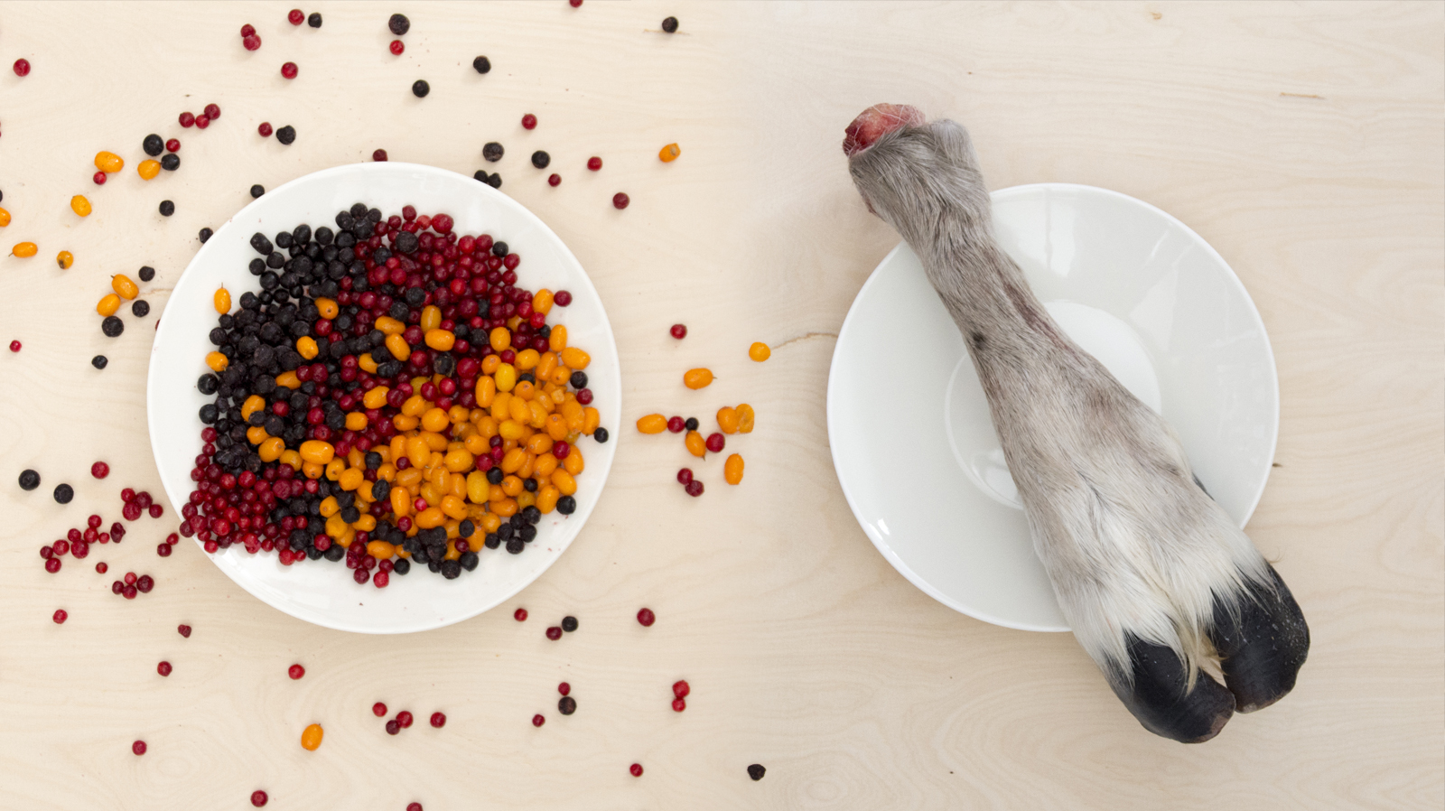 Otsikkokuvassa on vasemmalla arktisia marjoja ja oikealla poron jalka.