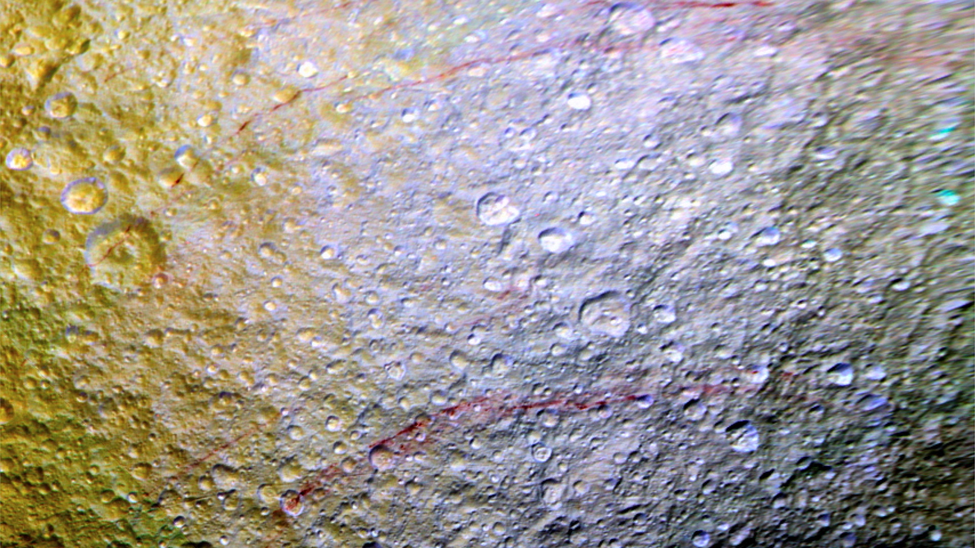 Saturnuksen Tethys-kuun pinnalta on löydetty outoja väriviiruja. Niiden leveys on vain muutamia kilometrejä, pituus useita satoja kilometrejä. Viirut ovat NASAn uutisen mukaan oudoimpia väriyksityiskohtia, mitä koko Saturnuksen kuuperheestä on löydetty.