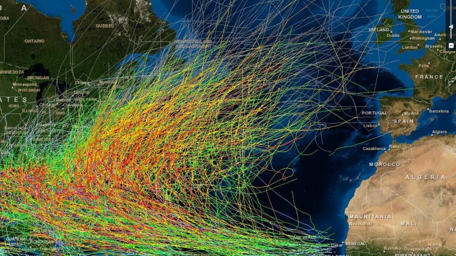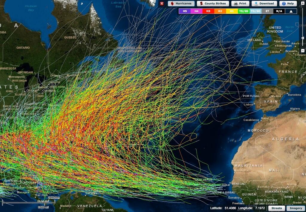 Kuvassa on 6000 vuodesta 1842 alkaen havaittua trooppista matalapainetta piirrettynä Pohjois-Atlantin kartalle; kuva on napattu Yhdysvaltain Ilmasto- ja meritutkimuskeskus NOAA:n erinomaisesta hurrikaanien reittitietokannasta, missä jokainen voi piirtää oman karttansa.