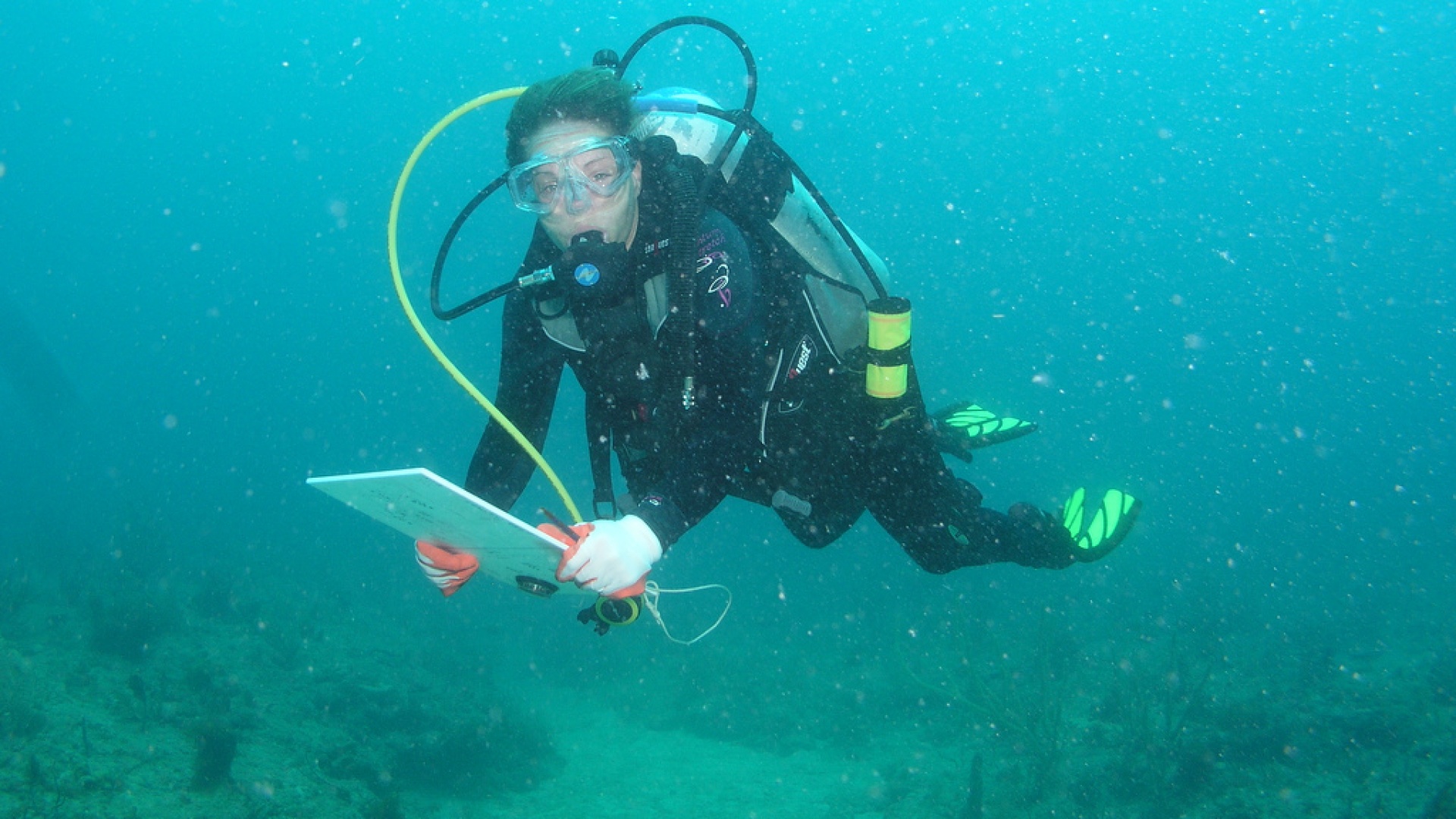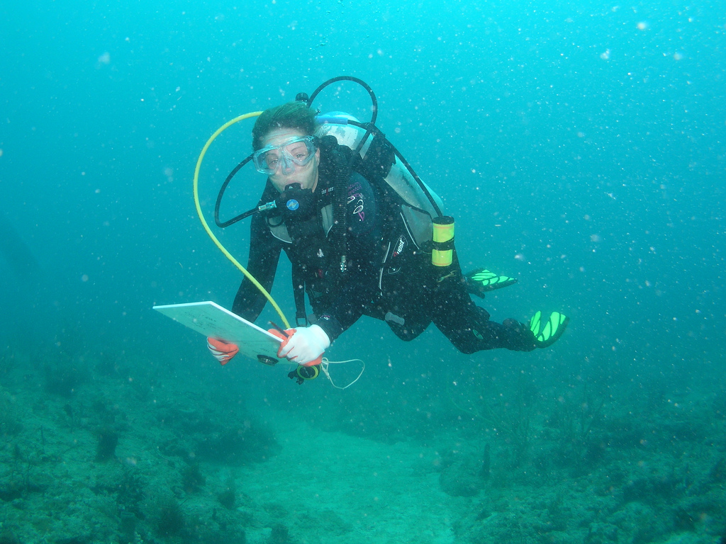 Kuvassa on merenpohjan kasvustoa kartoittava tutkimussukeltaja Shallow Reef -riutalla Floridassa. Työvälineinä kartoittajilla on suuri, muovinen, valkoinen nelioönmuotoinen raami, joka asetetaan pohjalle, ja jonka sisälle jäävä kasvusto, eliöstö sekä muu aines (mm. ihmisen heittämät roskat) kirjatan ylös veden alla toimivalle muoviselle kirjoituspinnalle.