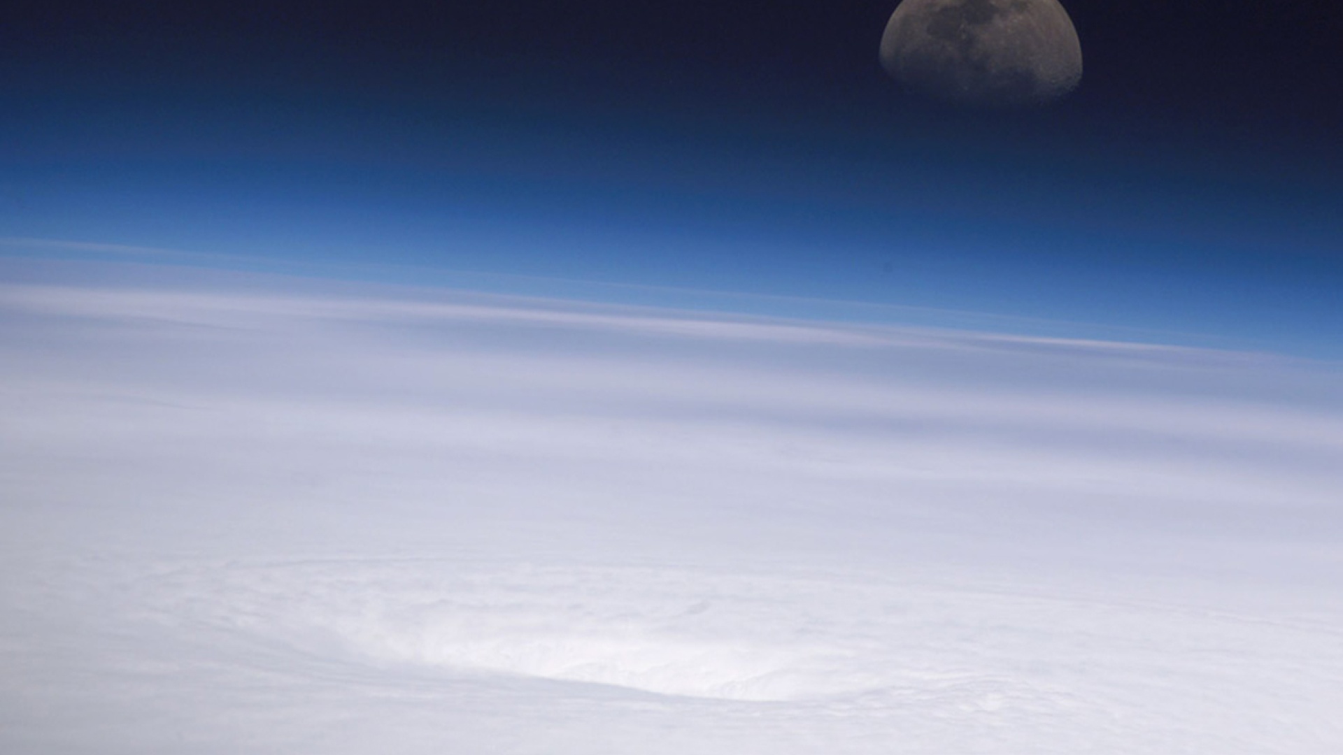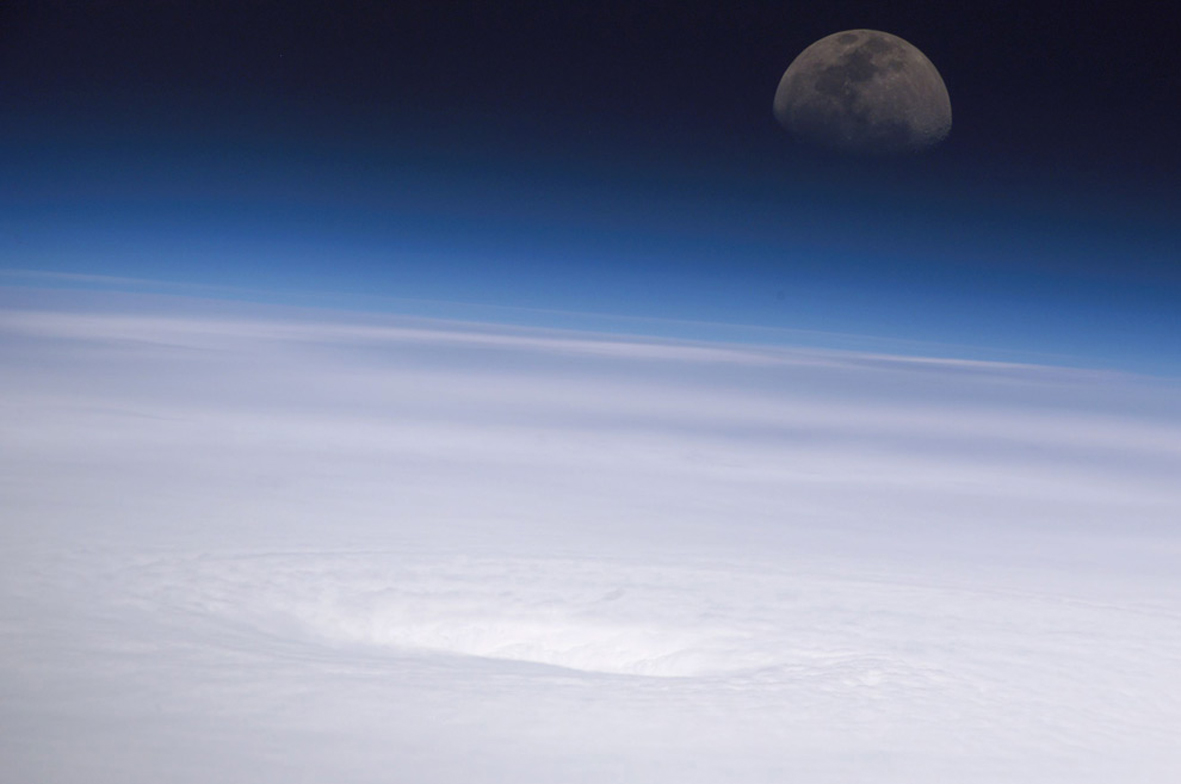 Vaikka tänä iltana onkin osittainen kuunpimennys, joka on syvimmillään kello 23.07, kuvan varsinainen kohde on Kuun sijasta hurrikaani Emilyn myrskynsilmä, joka näkyy kuoppana muuten tasaisessa pilvimassassa. Kuva on otettu Kansainväliseltä avaruusasemalta 16. heinäkuuta 2005. Meksikonlahdella ja Karibianmerellä riehunut Emily oli kuvanottohetkellä jo kategorian 4 hirmumyrsky, jossa tuulennopeus nousi lähes 250 kilometriin tunnissa eli melkein 70 metriin sekunnissa. Myrsky kuitenkin voimistui vielä saman päivän aikana korkeimpaan eli kategoriaan 5.