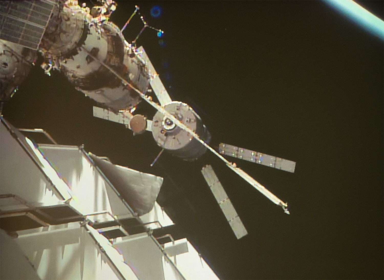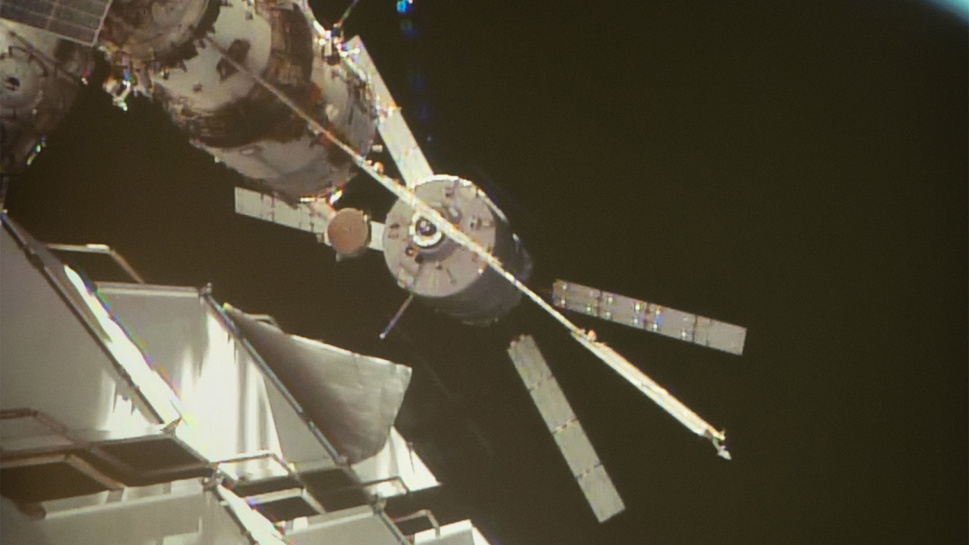 Kuvassa ATV on telakoitumassa avaruusasemaan. Itse rahtari on X-muotoisin aurinkopaneelein varustettu sylinterimäinen alus taka-alalla.