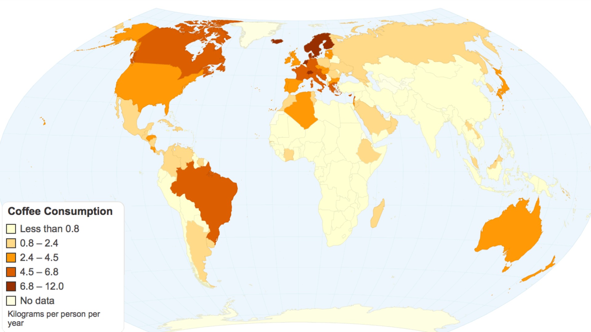 Mainion erilaisia datan visualisointikarttoja sisältävän http://chartsbin.com -sivuston yksi kartoista näyttää kuinka paljon maailmassa kulutetaan kahvia henkilöä kohden maittain tilastoituna. Ja yllättäen Suomi ja läntiset naapurimaamme ovat siellä huipulla – eikä vain maantieteellisesti. Pohjoismaissa juodaan eniten kahvia maailmassa henkeä kohden. Sen sijaan kahvintuottajamaat eivät kunnostaudu niinkään tässä tilastossa, vaikkakin viime aikoina suurin osa kahvin kulutuksen kasvusta on tapahtunut näissä maissa.