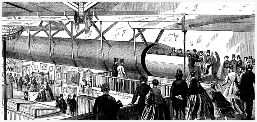 Tai matkustajien kannalta onneksi ei ihan. Vuonna 1869 Alfred Beach alkoi rakentaa New Yorkiin Broadwayn alle "pneumaattista metroa", joka valmistui seuraavana vuonna. Vaunun liikkuminen perustui yli- ja alipaineen käyttöön samaan tapaan kuin putkipostijärjestelmässä. Vauhtia antoi 44 tonnin painoinen tuuletin: kun "juna" oli päässyt 95-metrisen radan pääteasemalle, puhaltimen lavat käännettiin ja se imi vaunun takaisin lähtöasemalle. Uutuudenviehätys oli melkoinen, sillä ensimmäisen vuoden aikana Beachin menopelillä matkusti liki puoli miljoonaa ihmistä. Maanalaisen vaunuun mahtui kerralla 22 matkustajaa, jotka nousivat kyytiin Devlinin vaatetusliikkeessä. Beach ei saanut heti lupaa jatkaa metrolinjaa ja kun se vihdoin myönnettiin, kiinnostus uudenlaista kulkupeliä kohtaan oli hiipunut ja lyhyt koerata suljettiin. Tunnelista ei ole enää jälkeäkään, sillä sen kohdalla maan alla on nykyisin City Hall Station.