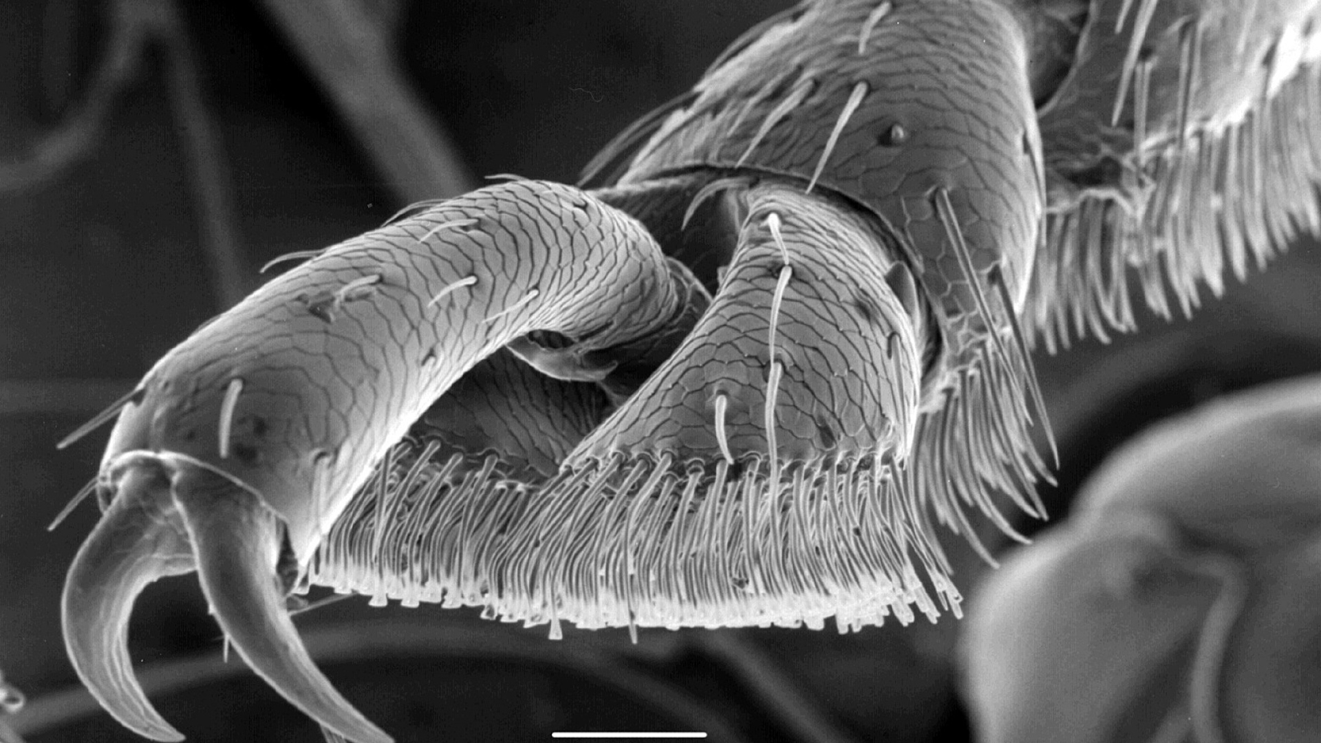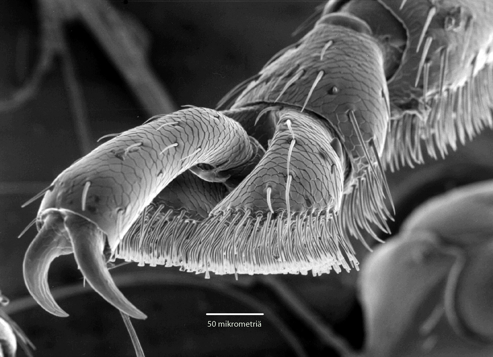 Jos lähistöllä pörräävä koppakuoriainen laskeutuu vaikkapa kädelle, se tuntuu tarraavan kiinni lujasti - eikä ihme. Pyyhkäisyelektronimikroskoopin kuva paljastaa, millainen on lehtikuoriaisen jalka väkäsineen ja karvoineen. Ne varmistavat lujan otteen, kun kuoriainen taiteilee milloin mitenkin päin kasvien lehdillä ja kukissa. Valkoisen mittakaavaviivan pituus on 50 mikrometriä eli samaa luokkaa kuin hiuksen paksuus.