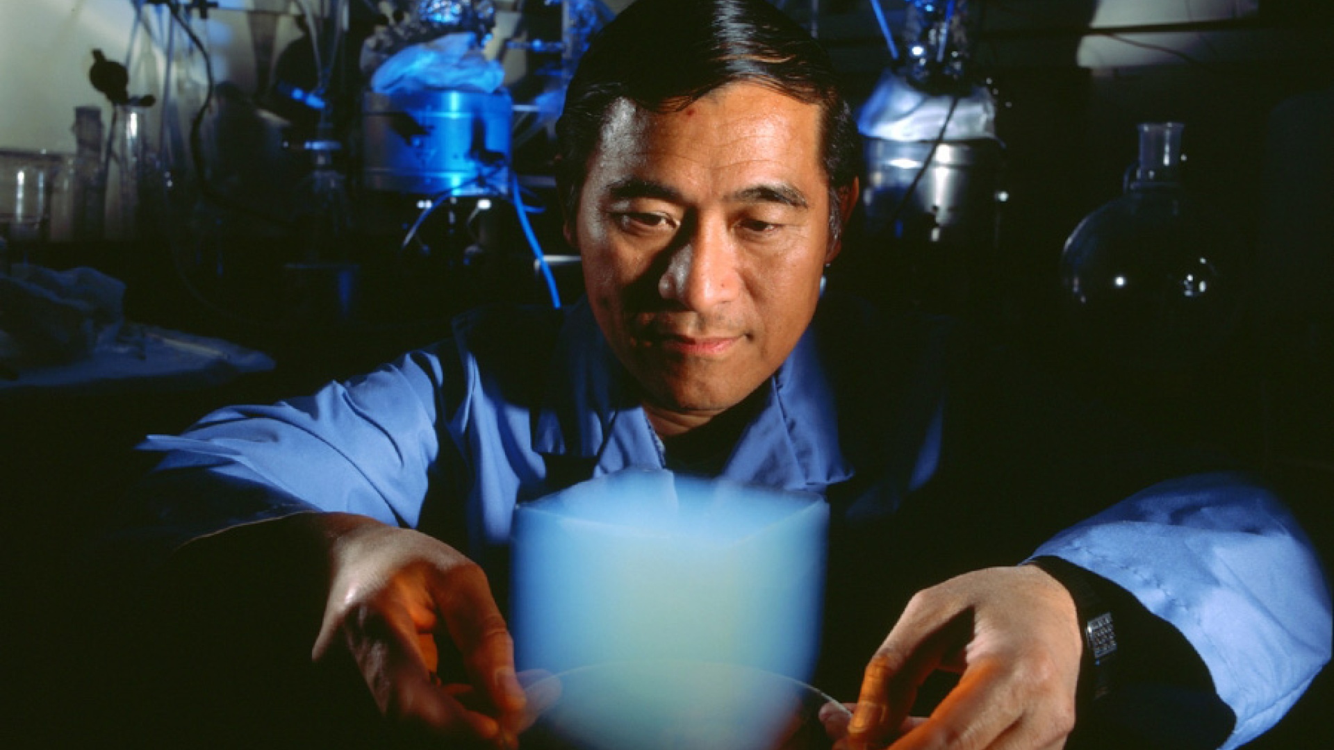 NASAn tutkija Peter Tsou pitelee edessään ns. kiinteää savua, eli aerogeeliä – maailman kevyintä tiedettyä ainetta.