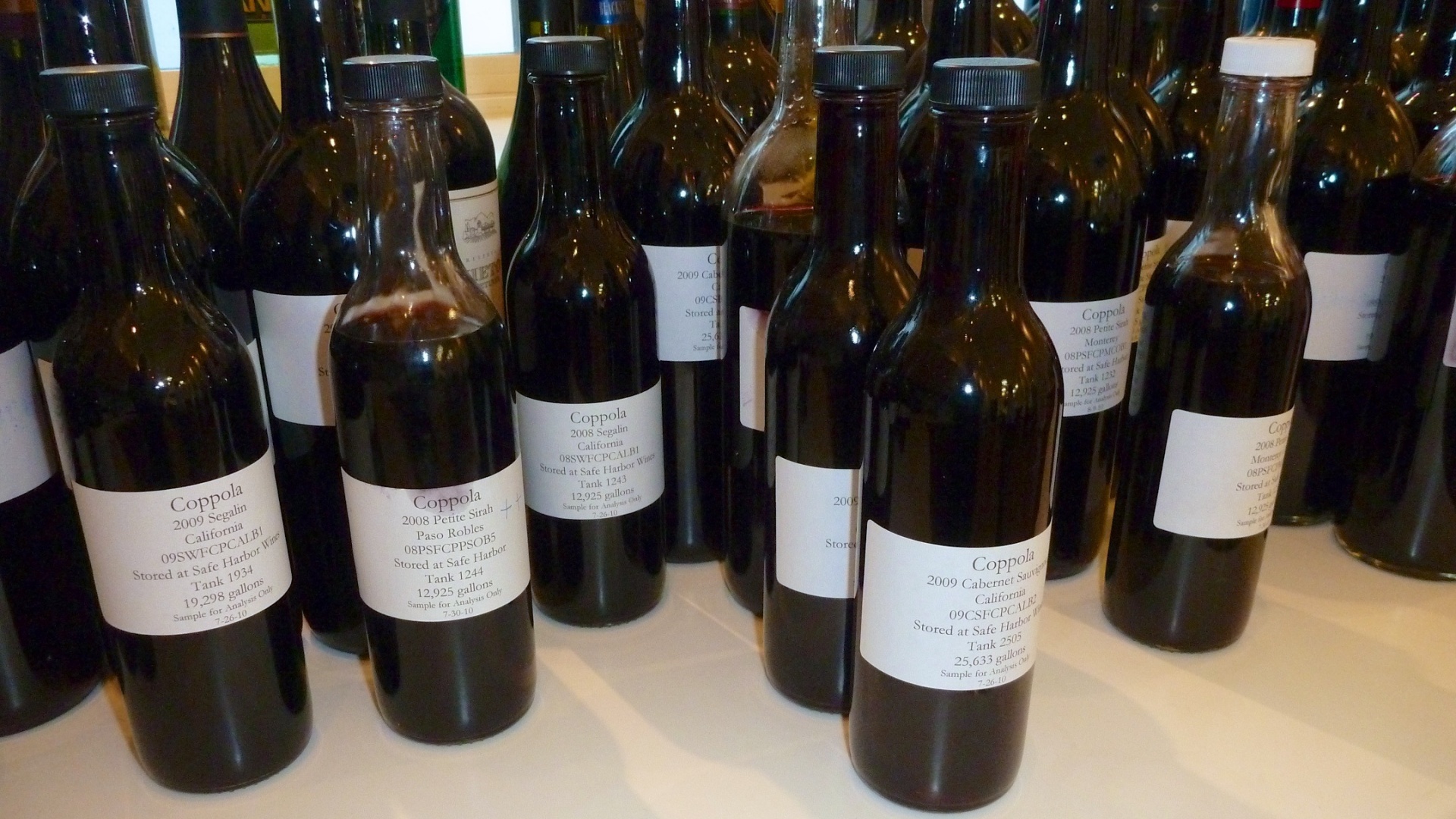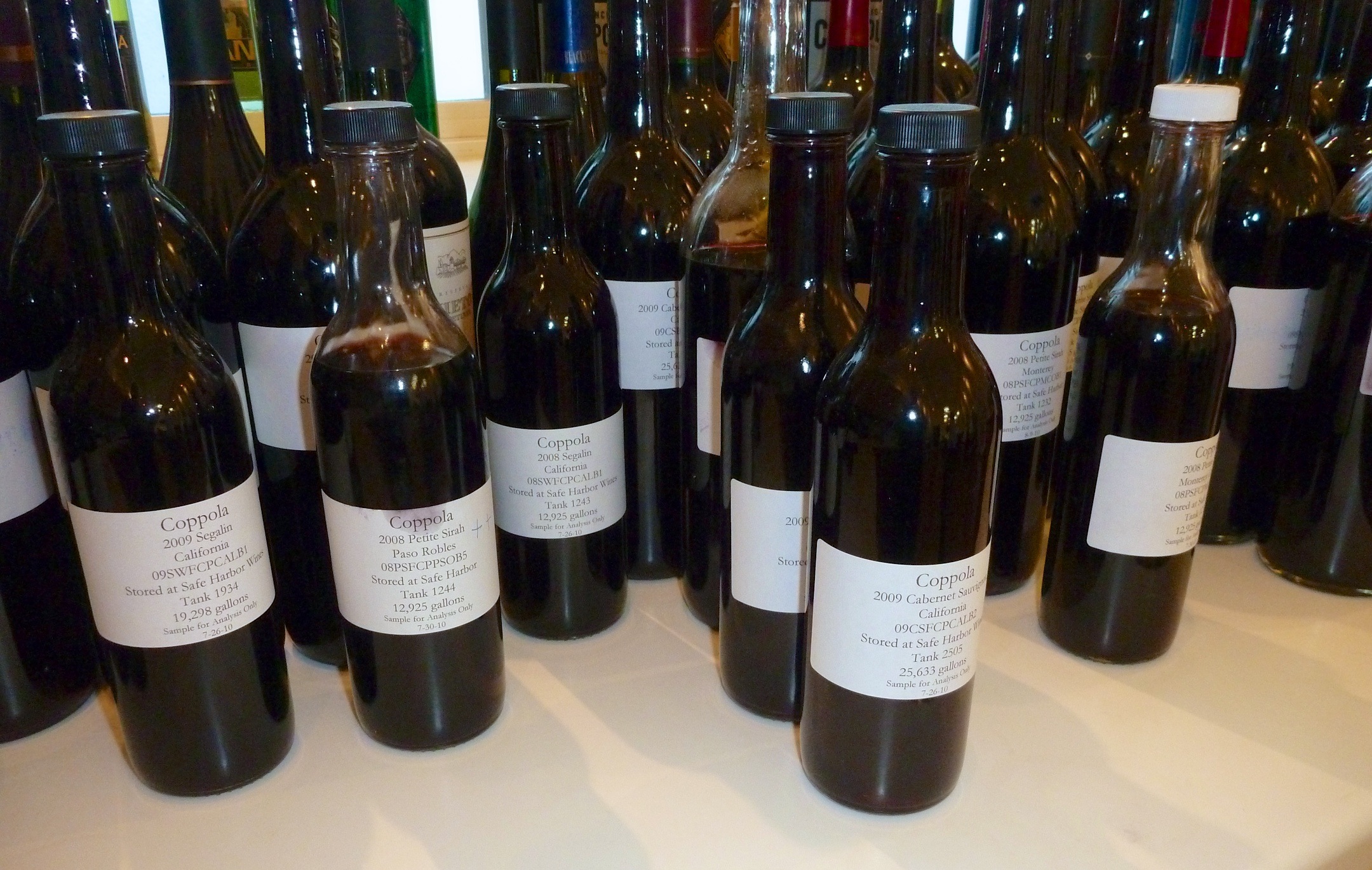 Kuvassa on näytepulloja Coppola-viinitilalta Kaliforniasta; jokaisesta viinitankista otetaan säännöllisesti näytteitä, joita analysoimalla voidaan päättää tarkasti milloin viini on sopivaa pullotukseen ja mitä viinieriä kannattaa sekoittaa keskenään. Luonnollisesti näytteiden avulla myös varmistetaan viinin laatua.