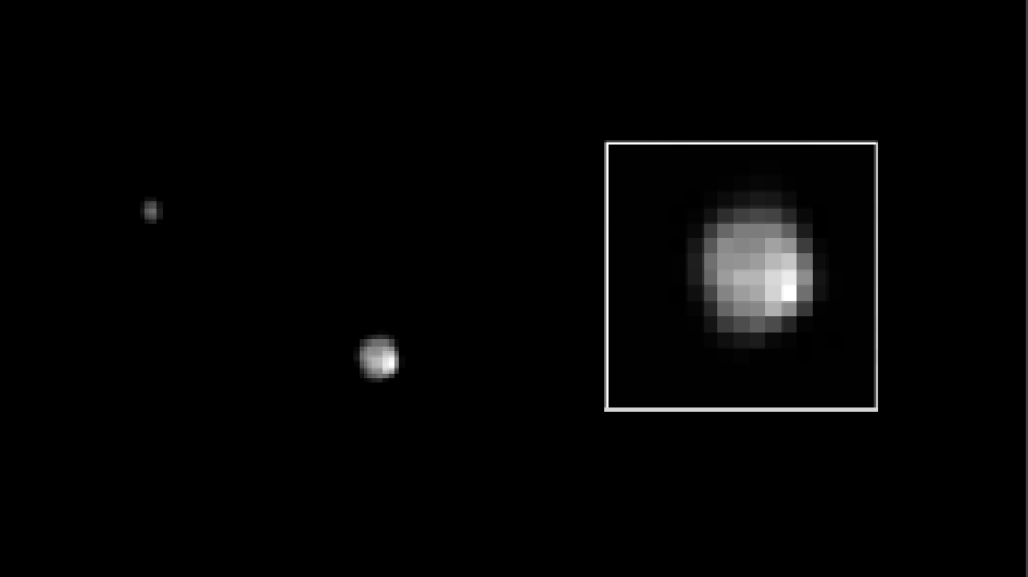Kehyksen sisällä on kolme kertaa suurennettu kuva Plutosta. Pinnan kirkkain kohta on napaseuduilla, mikä viittaisi jäästä tai lumesta muodostuneeseen napalakkiin.