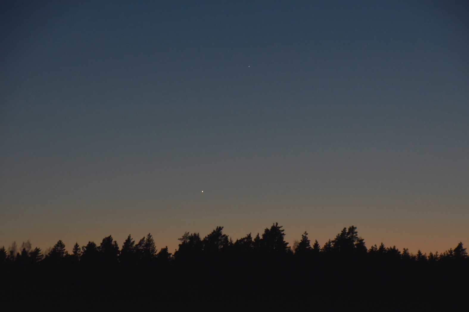Planeetat näkyvät vielä tovin melko lähellä toisiaan – itse asiassa niiden välinen etäisyys kutistuu, kunnes ne ovat 19.3. lähimmillään. Edellisenä iltana samaan ryppääseen tunkee vielä kapoinen kuunsirppi. Venus näkyy iltapuolen taivaalla koko kevään, mutta Merkurius on tapansa mukaan vain pikaisella visiitillä. Jos lähipäivinä on iltaisin selkeää, kannattaa käydä vilkaisemassa näkymää, sillä legendan mukaan planeettojen liikkeitä 1600-luvun alussa setvinyt Johannes Keplerkään ei onnistunut näkemään Merkuriusta.