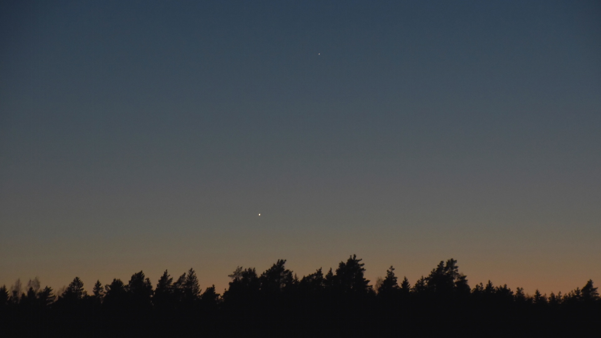 Vajaa tunti auringonlaskun jälkeen kirkkaampi Venus erottuu jo hyvin matalalla läntisellä taivaalla. Kun taivas hieman tummuu, alkaa erottua myös Merkurius, joka on tällä hetkellä Venuksesta yläoikealle noin kello yhden suunnassa. Asetelma muuttuu kuitenkin melko nopeasti, sillä etenkin Merkurius liikkuu taivaalla melko vauhdikkaasti.