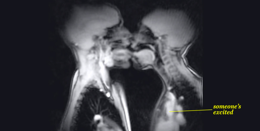 Otsikkokuvassamme on kuvattuna suutelevat ihmiset MRI-laitteella, eli kuvannettuna ydinmagneettiseen resonanssiin perustuvalla mageettikuvauslaitteella. Normaalisti sairaanhoidossa käytettävä laite on erinomainen paitsi siksi, että siinä ei tutkittavaan potilaaseen ei jouduta kohdistamaan röntgensäteilyä, vaan hänen sisuskalunsa saadaan näkyviin veden sisältämien vety-ytimien magneettikentässä lähettämää radiosignaalia havaitsemalla. Ja verrattuna normaaliin röntgenkuvaan on MRI erinomainen myös siksi, että sen avulla pystytään kuvantamaan videoita – siis ihmiskehoa toiminnassa.