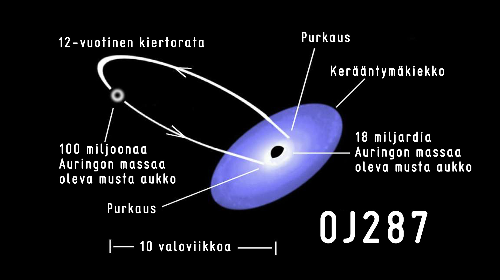OJ287 on itse asiassa 3,5 miljardin valovuoden päässä meistä Sisiliskon tähdistössä oleva galaksi. Sen keskellä on massiivinen musta aukko, jolla on pienempi seuralainen, myös musta aukko, jonka liikettä tarkkailemalla suuremman mustan aukon ominaisuudet selviävät.
