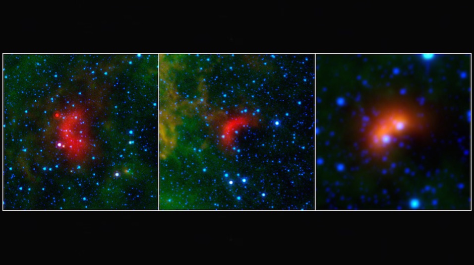 Kaksi vasemmanpuoleista kuvaa on otettu Spitzer-avaruusteleskoopilla, oikeanpuoleisin WISE-teleskoopilla. Kuvissa iskuaallot näkyvät punaisina, tähtienvälinen pöly vihreinä haituvina ja tähdet sinisinä.