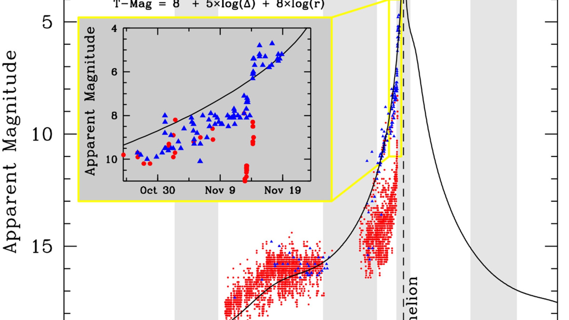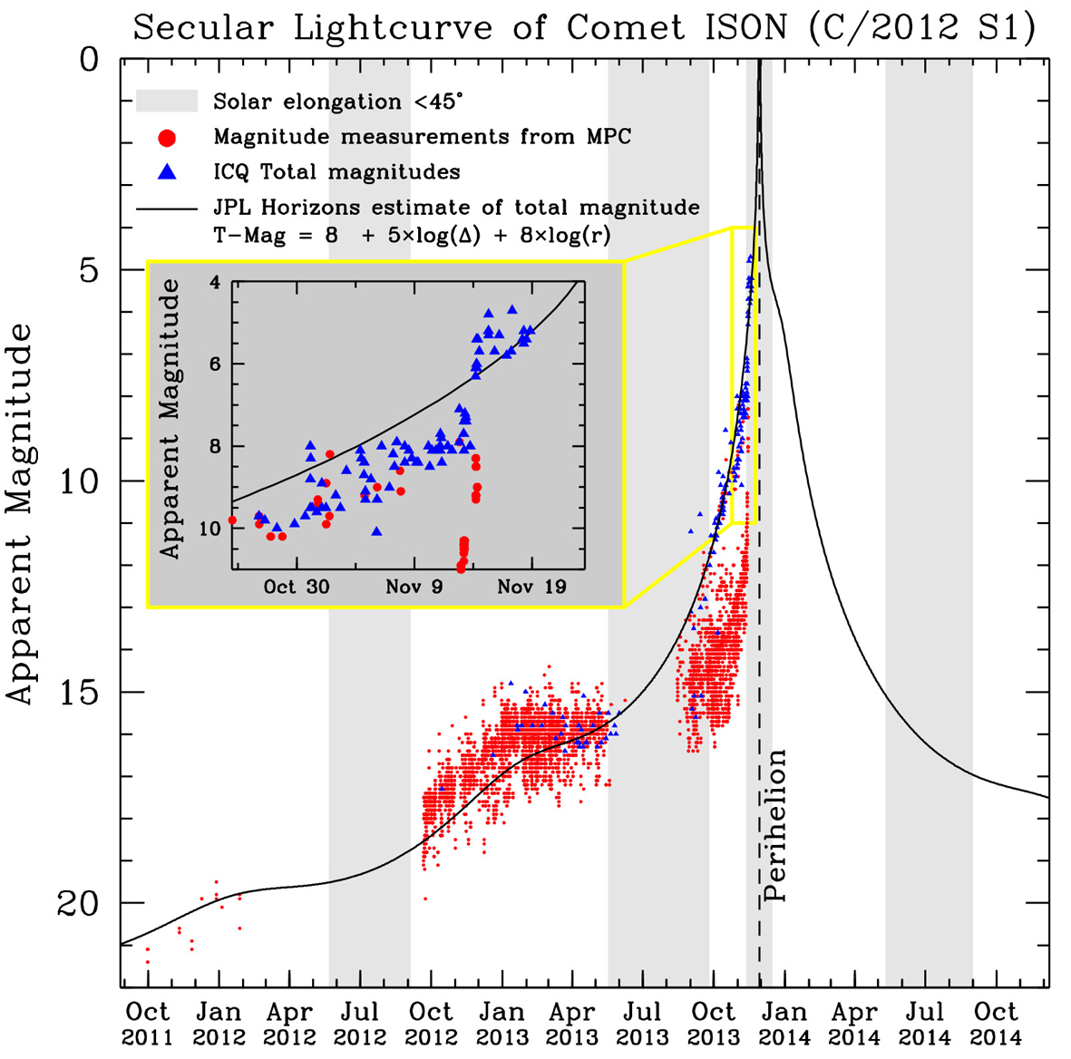 Matthew Knightin 19. marraskuuta NASAn Comet ISON Observing Campaign -sivustolle kokoama valokäyrä kertoo, miten komeetan kirkkaus on kasvanut sen lähestyessä periheliään. Yhtenäinen musta viiva kuvaa ennustettua kirkkautta, punaiset pallot IAU:n (International Astronomical Union, Kansainvälinen tähtitieteen unioni) Minor Planet Centeriin raportoituja usein melko monenkirjavia havaintoja ja siniset kolmiot Harvardin yliopiston International Comet Quarterlyn keräämiä, kokeneiden havaitsijoiden tekemiä arvioita.