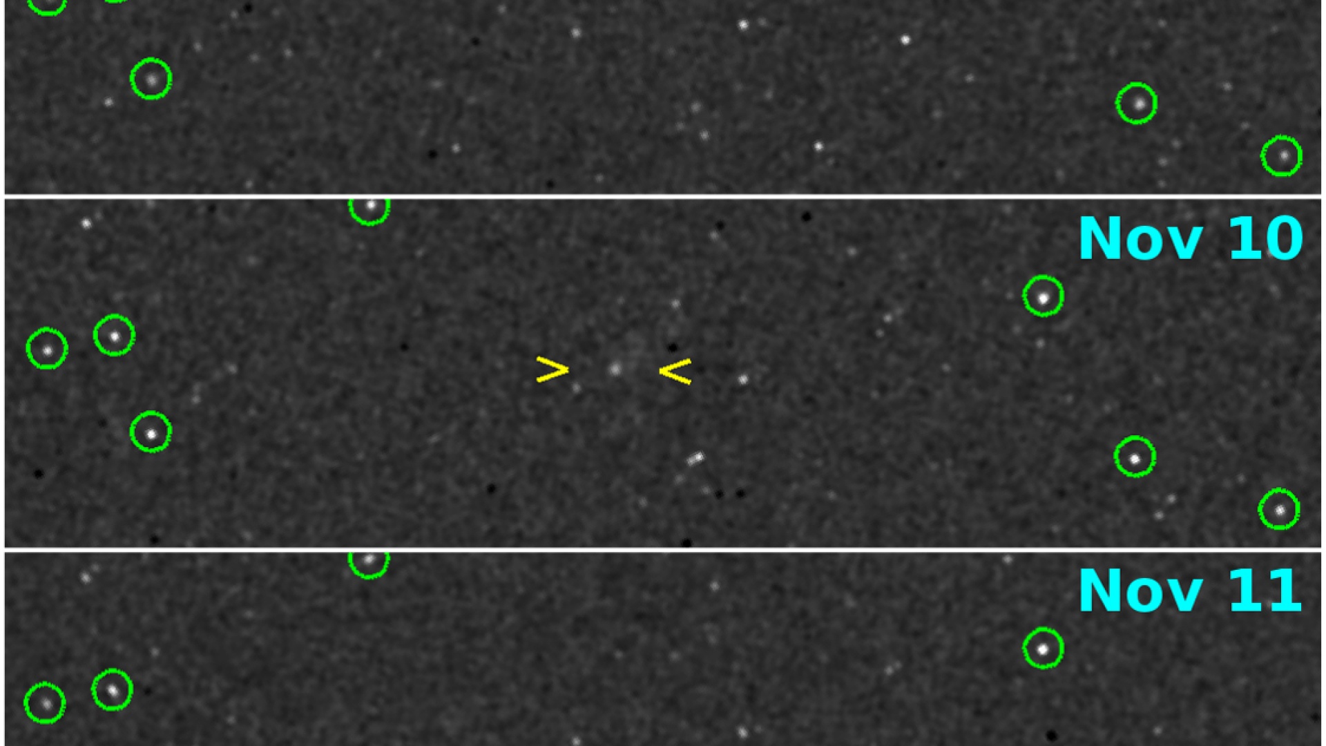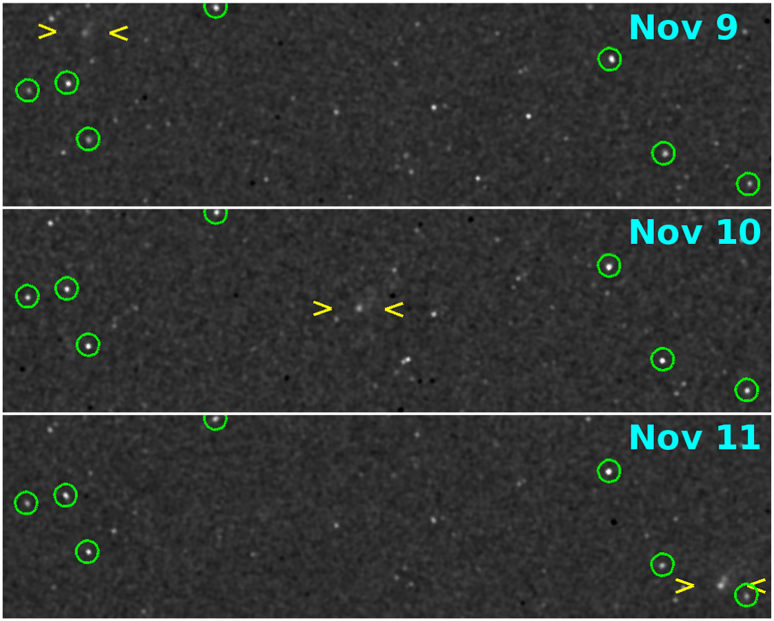 Aurinkoa lähestyvä ISON-komeetta ohitti 19. marraskuuta sisimmän planeetan Merkuriuksen noin 36 miljoonan kilometrin etäisyydeltä. Kyseessä ei ollut kovin likeinen ohitus, sillä lokakuun alussa komeetta ohitti Marsin vain runsaan 10 miljoonan kilometrin päästä. Silloin MRO-luotain (Mars Reconnaissance Orbiter) sai komeetasta muutaman suttuisen kuvan. Merkuriusta kiertää tällä hetkellä MESSENGER-luotain, jonka kamerat käännettiin niin ikään kohti ISON-komeettaa. Tulos ei ollut kovin paljon kummoisempi kuin Mars-luotaimen otoskaan: komeetta näkyy pienenä, utuisena läikkänä, joka liikkuu tähtien suhteen. Planeettojen pinnanmuotoja yksityiskohtaisesti kuvaavien luotainten kameroita ei ole suunniteltu mustalla taivaalla viilettävien kaukaisten komeettojen ikuistamiseen, joten mikä tahansa kuvallinen rekisteröinti on merkittävä tai ainakin mielenkiintoinen saavutus. Oheisessa kuvasarjassa ISON-komeettaa on kuvattu 9.–11. marraskuuta.