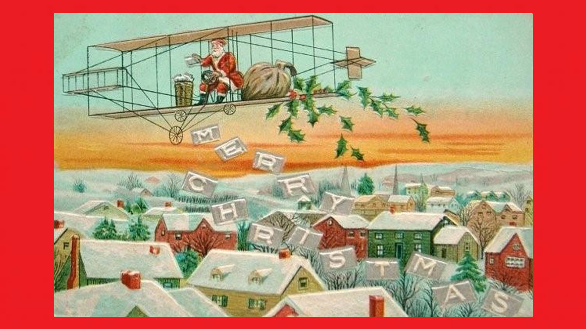 Kuvassa joulupukin lentopelinä ei kuitenkaan ole Wright-veljesten kaksitaso, vaikka se näyttää kovasti sellaiselta. Lentämisen alkuaikoina Flyer-tyyliset kaksitasoiset työntöpotkurilla varustetut koneet, joiden korkeusvakaaja oli edessä ja sivuvakaaja takana, olivat suosittuja, ja kuvassa on todennäköisesti vuonna 1911 valmistunut Glenn Curtissin suunnittelema malli D (niin sanottu "Curtiss Pusher", eli "Curtissin työntyri"). Se oli maailman ensimmäinen sarjatuotantoinen lentokone ja se tuli kuuluisaksi myös toisesta saavutuksesta: sillä noustiin ja laskeuduttiin ensimmäisen kerran laivan kannelta. Sotilailaskäytön lisäksi kone siis sopi erinomaisesti joulupukille, jonka menopeli vaati hyvin lyhyttä lasku- ja nousukiitoa!
