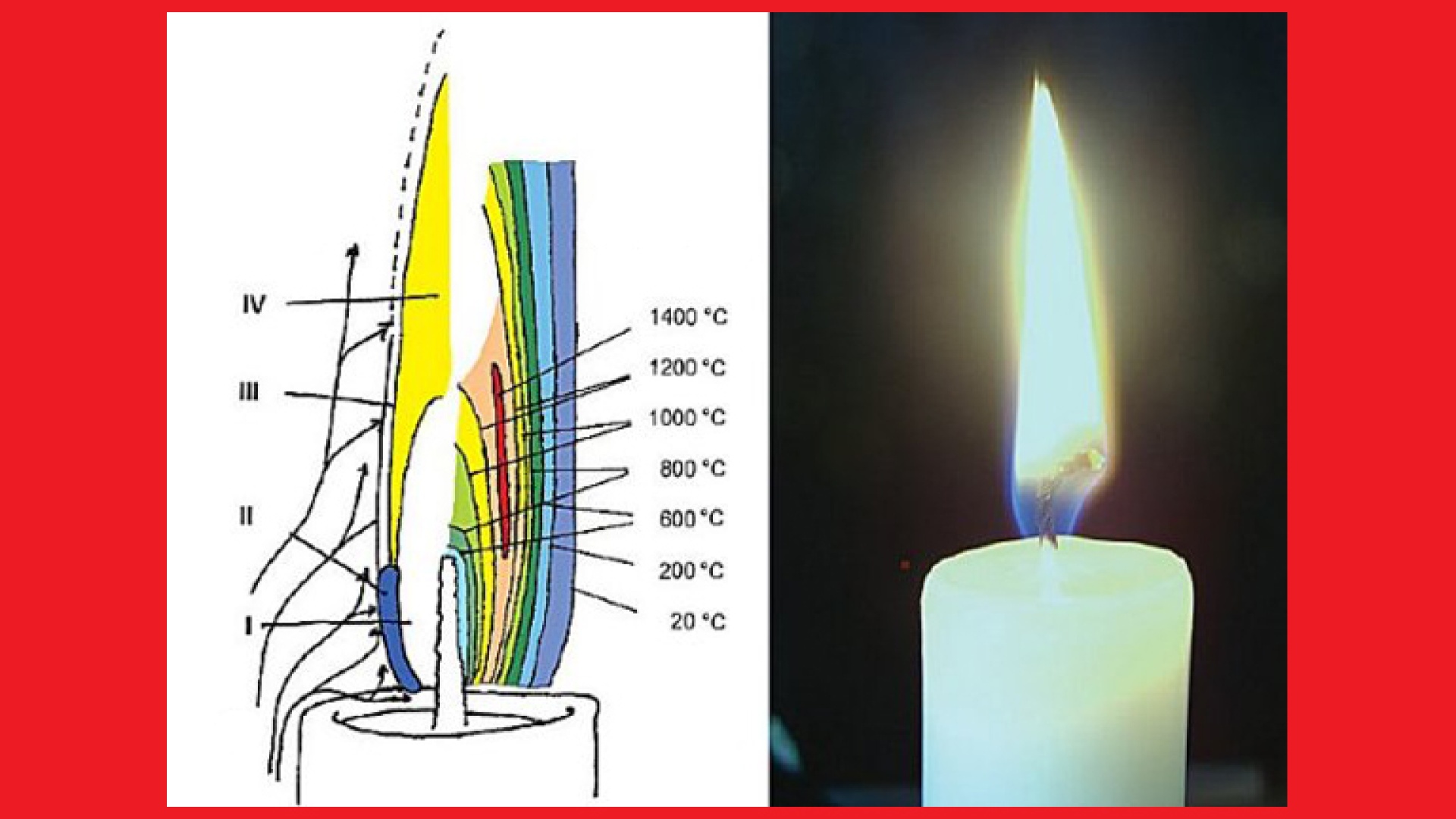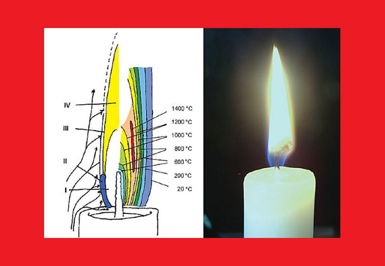 Kuvaan on merkitty paitsi liekin eri osien lämpötilat celsiusasteissa myös vyöhykkeet, joilla tapahtuu hieman eri ilmiöitä. Ykkösvyöhykkeellä eli liekin sisimmällä alueella parafiinin, steariinin ja/tai mehiläisvahan molekyylit hajoavat. Kakkos- ja kolmosvyöhykkeellä tapahtuu suurin osa varsinaisesta palamisesta, mutta enin osa valosta tulee liekin keskellä olevalta nelosvyöhykkeeltä. Seikkaperäinen kolmiosainen selvitys (englanniksi) kynttilän kemiasta löytyy ChemistryViews-sivustolta (osa 1, osa 2, osa 3).