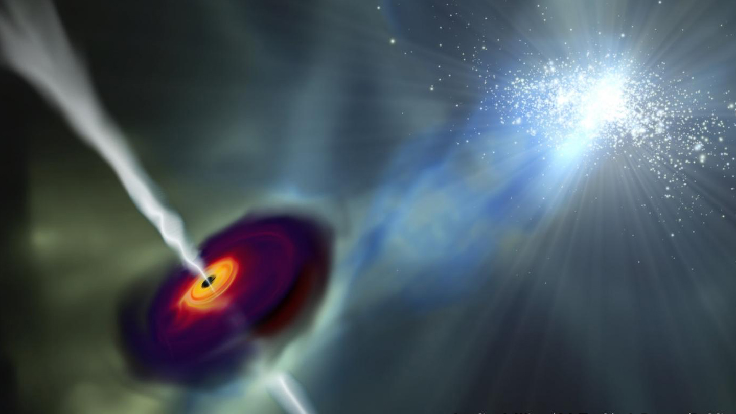 Otsikkokuvassa on hahmotelma siitä, miltä protogalaksin lähelle syntyvä supermassiivinen musta aukko voisi näyttää. Sen massa vastaa kymmeniä tuhansia Auringon massoja ja sitä ympäröi kiertymäkiekko, mistä siitä lähtee symmetrisiä materiasuihkuja. Nuoressa protogalaksissa (oikealla) loistaa kirkkaana suuri joukko nuoria massiivisia tähtiä. Kuva vastaa simulaation tilannetta punasiirtymällä z=24, noin 140 miljoonaa vuotta alkuräjähdyksen jälkeen. Kuvaoikeudet: J. Wise (Georgia Tech) & J. Regan (Dublin City).