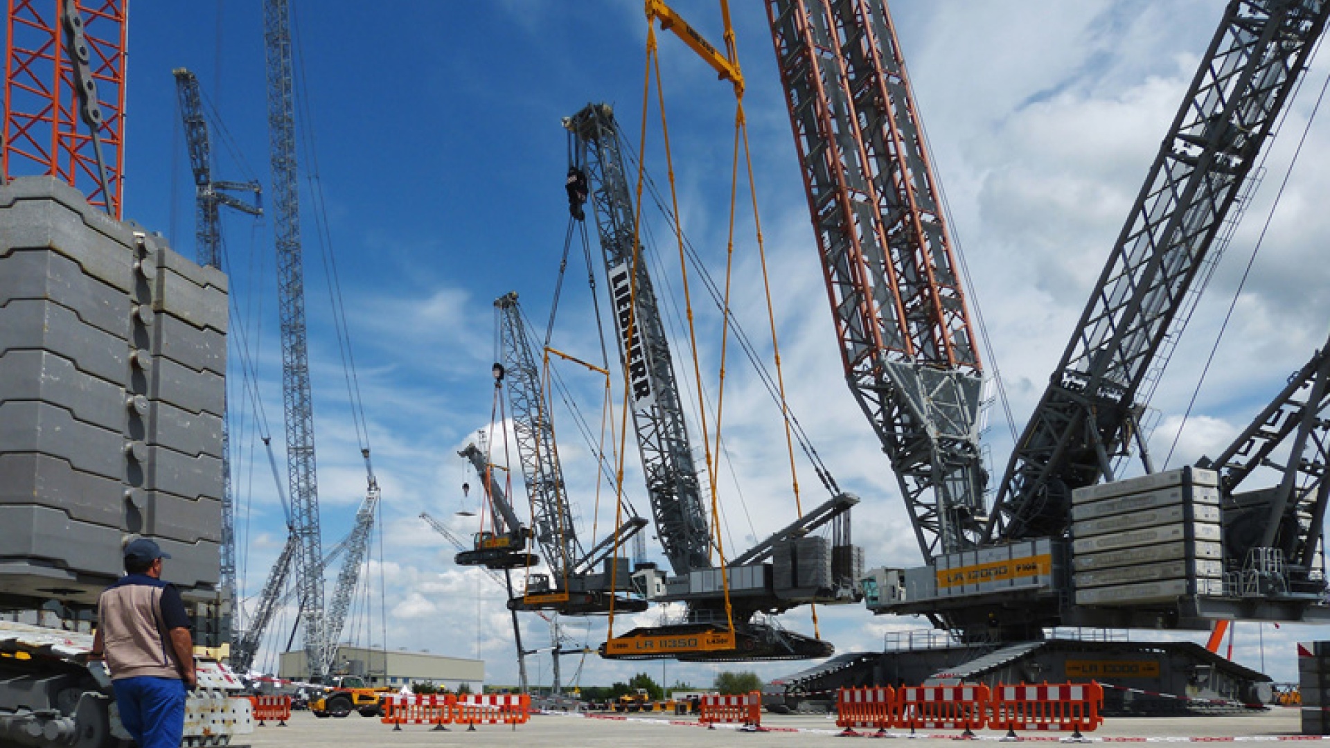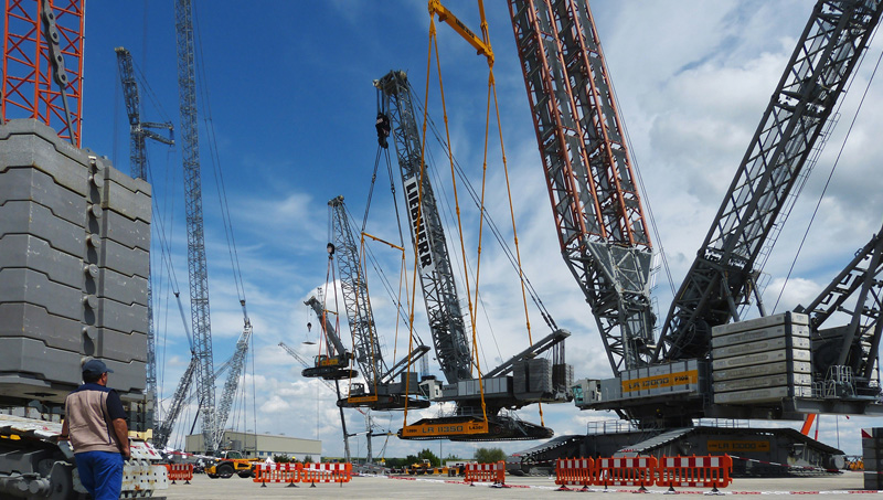 Kuvassa on saksalaisen nosturivalmistajan Liebherrin järein nosturi, LR-13000, joka nostaa pienempiä veljiään. Erityisesti voimalaitosten rakentamiseen suunniteltu LR-13000 pystyy nostamaan 3000 tonnia painavia kuormia ja kurottamaan 126 metrin päähän – telaketjuilla liikkuva laite on todellinen jättiläinen.