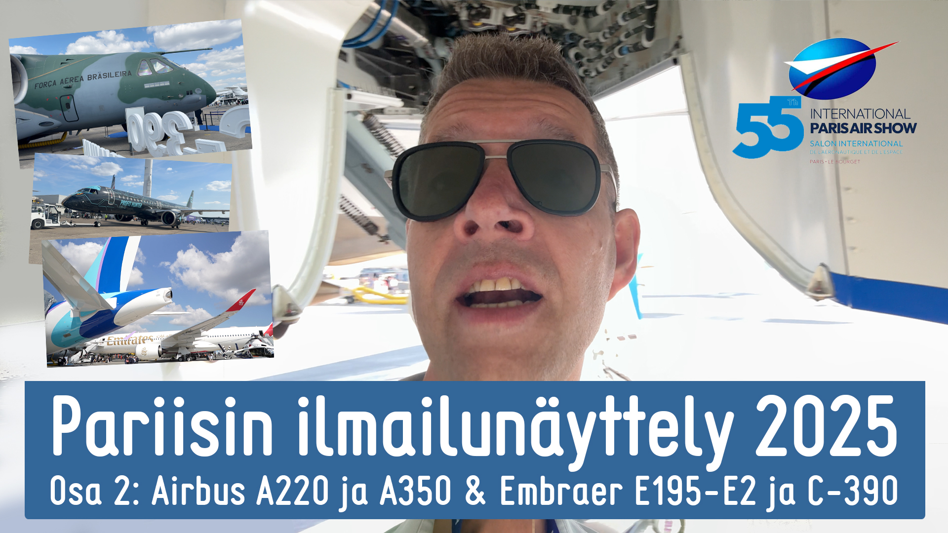 Ensin esittelyssä ovat Airbus A220 ja Embraer E195-E2, sitten perusteellisessa esittelyssä on Emirates -lentoyhtiön tuliterä Airbus A350 ja lopuksi mennään sisälle Embraer C-390 -kuljetuskoneeseen (joka on todennäköisesti myös Ilmavoimien ostoslistalla).