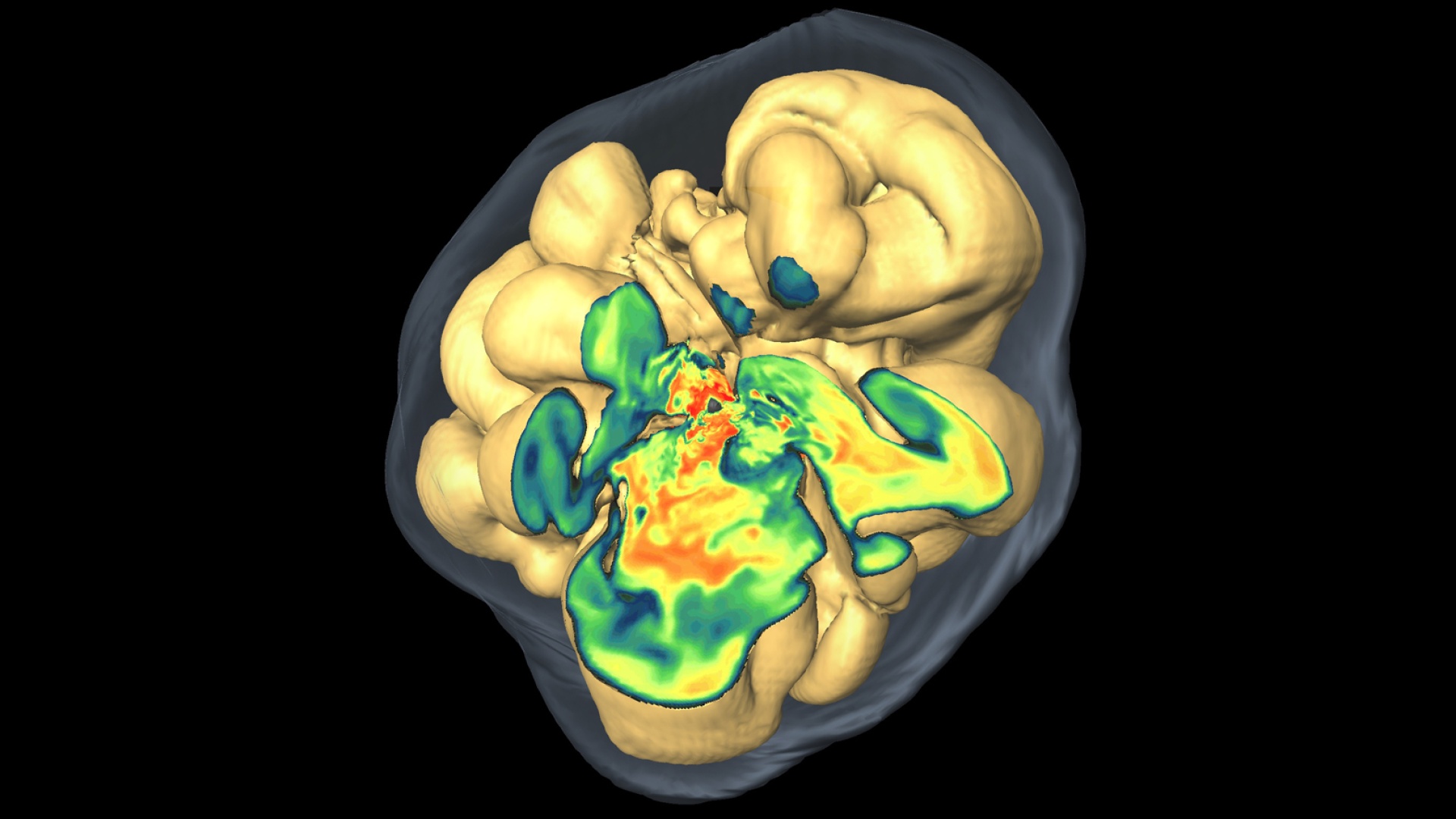 Räjähdyksiä voidaan onneksi simuloida. Tietokonemallinnuksessa on tarkasteltu tähden sisäosien luhistuessa vapautuvien neutriinojen aiheuttamaa ulospäin suuntautuvaa painetta. Kuuma kaasu laajenee nopeasti ja työntää edellään paineaaltoa. Kuva esittää tilannetta 0,4 sekuntia räjähdyksen jälkeen – eli käytännössä räjähdys on parhaillaan tapahtumassa. Myllerryksen keskellä näkyvä pieni harmaa laikku on vastasyntynyt neutronitähti.