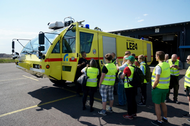 Palopäällikkö Jari Terviö esitteli autoja ja niiden laitteita, joita onneksi ei ole tarvittu koskaan lentoasemalla tapahtuneen lento-onnettomuuden vuoksi. Sen sijaan pienempiä paloja ja onnettomuuksia tapahtuu koko ajan, aivan kuten pienessä kaupungissa. Lentoasemahan on kuin pieni kaupunki, missä tosin ei ole asukkaita, vaan lähes miljoona vierailijaa joka kuukausi. Vuonna 2016 tähän saakka matkustajia on ollut tähän mennessä noin 5 300 000.