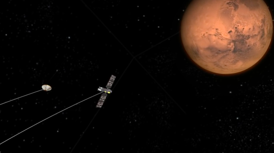 ESA:n animaatio siitä, kun ExoMars 2016 -lentoon kuuluvat TGO ja Schiaparelli saapuvat Marsiin.