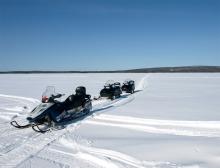 Yhtenä – tosin koko päivän mittaisena – ohjelmanumerona oli moottorikelkkaretki. Tunturin rinnettä ylös ja toista alas. Aavaa järvenselkää pitkin katsastamaan verkkokalastajien hyistä puuhaa. Autiotuvalle ahmimaan eväitä ja taas ”tien” päälle.
